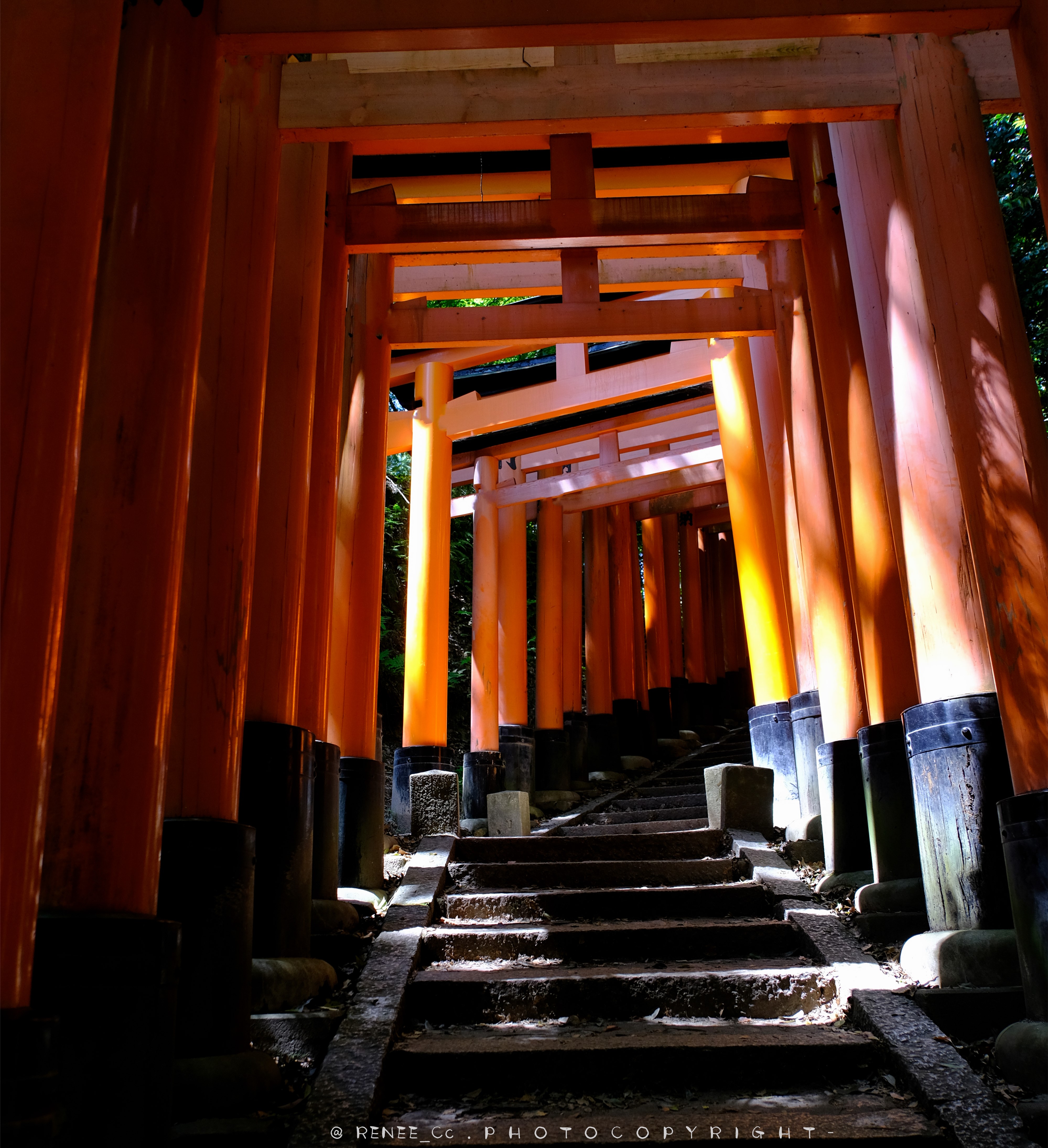 这段路真的很美,光影从头顶的缝隙映照下来,洒在鸟居上,深深浅浅。越往上走会发现人会越来越少,你会看到想要的风景也会拍到只属于你的那个定格。