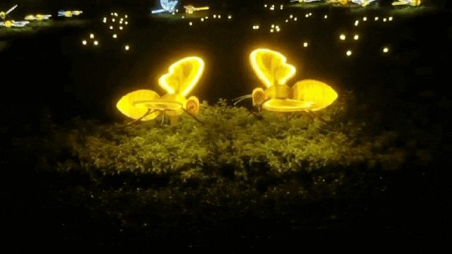 在四季花海·花乐汤温泉感受光影里的浪漫,漫天飞舞的昆虫忽闪忽闪,飞过花丛,飞过草蔓……相比白天的静谧,夜幕下的花乐汤显得更加撩人。