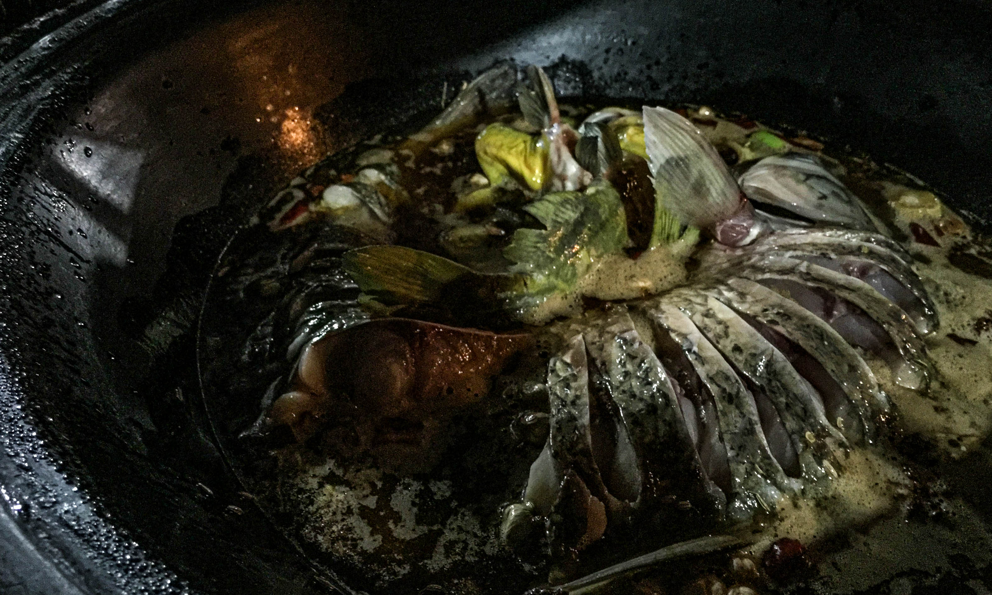 把一条忘记什么品种的大鱼、蔬菜和调料放下锅后,等待鱼快炖熟时在锅的四周贴上花卷和饽饽,好像天津的小鱼贴饽饽,只不过沧州的做法锅大鱼也大,等到鱼和花卷饽饽都熟了尝一口味道很鲜美,花卷里掺着鱼的香味,好好吃!