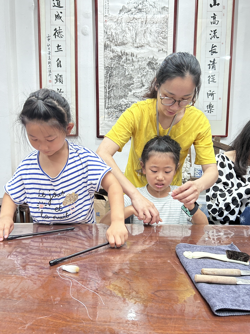 每个孩子都可以体验一把手捞宣纸,亲身感受一张宣纸出品的不易,手别抖,心要细,一张纸就从手中诞生啦~纸捞好后交给工作人员烘干,在成品宣纸上拓印上自己的生肖再包装好就可以带回家了~