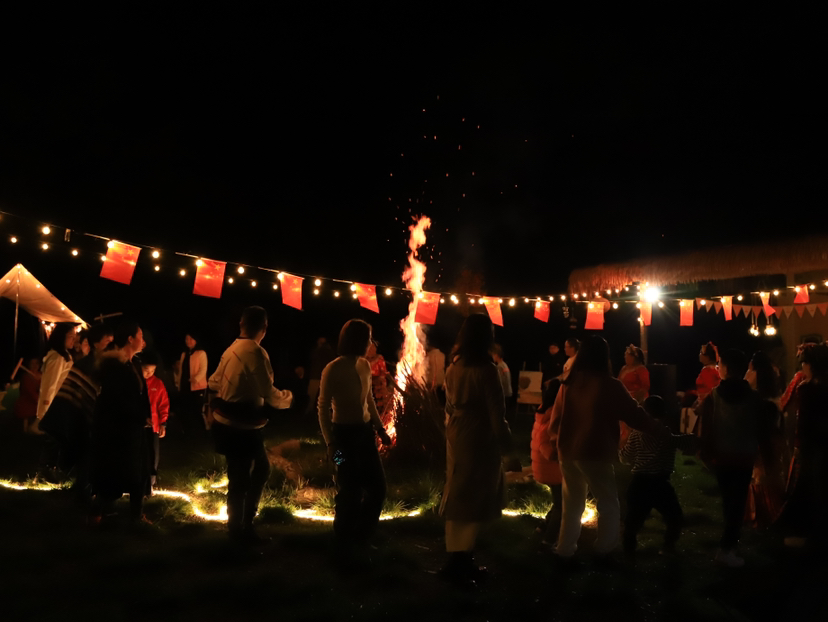 吃饱喝足之后,点燃篝火,音乐响起,大家围着篝火、伴随音乐节奏起舞