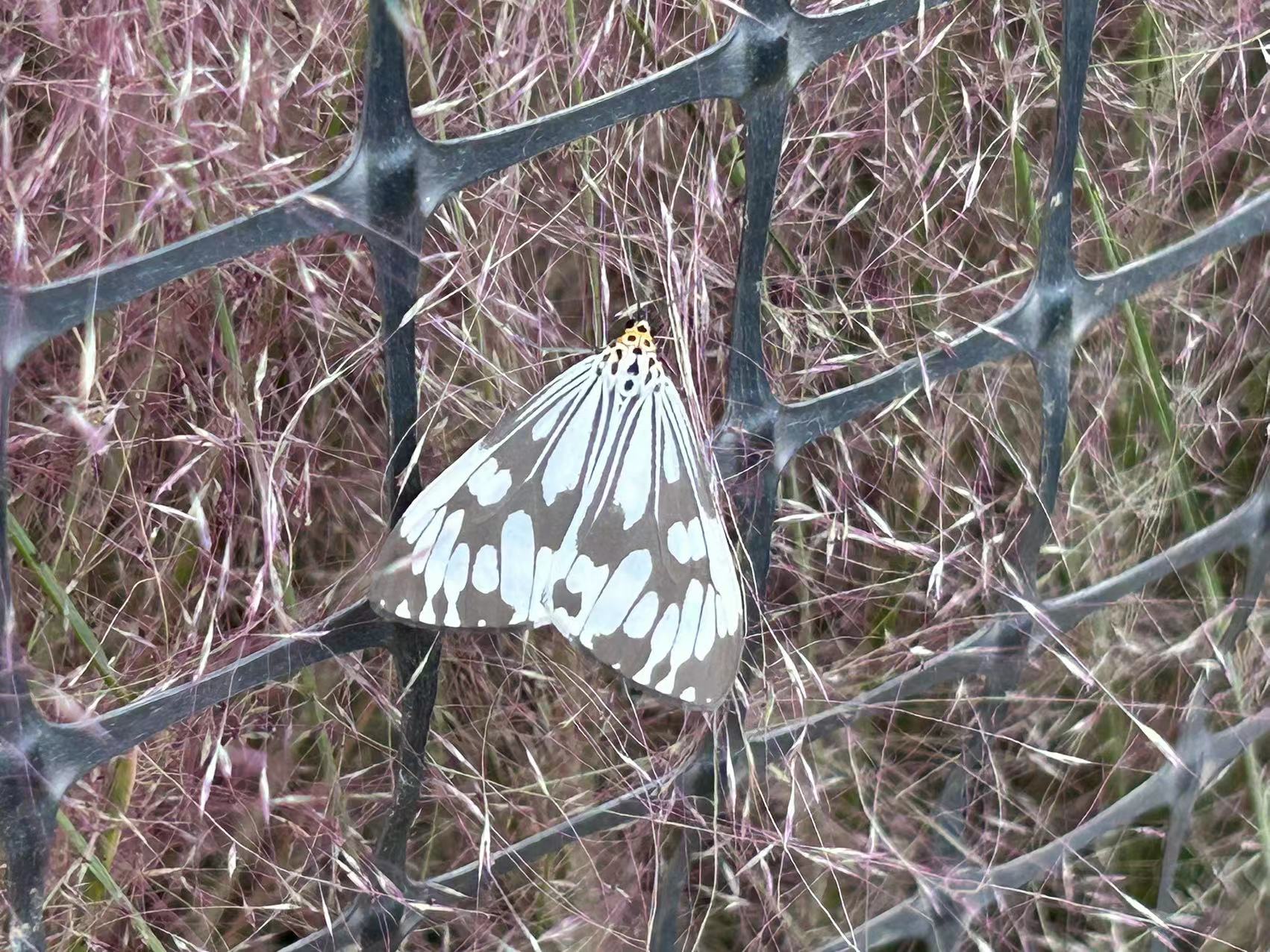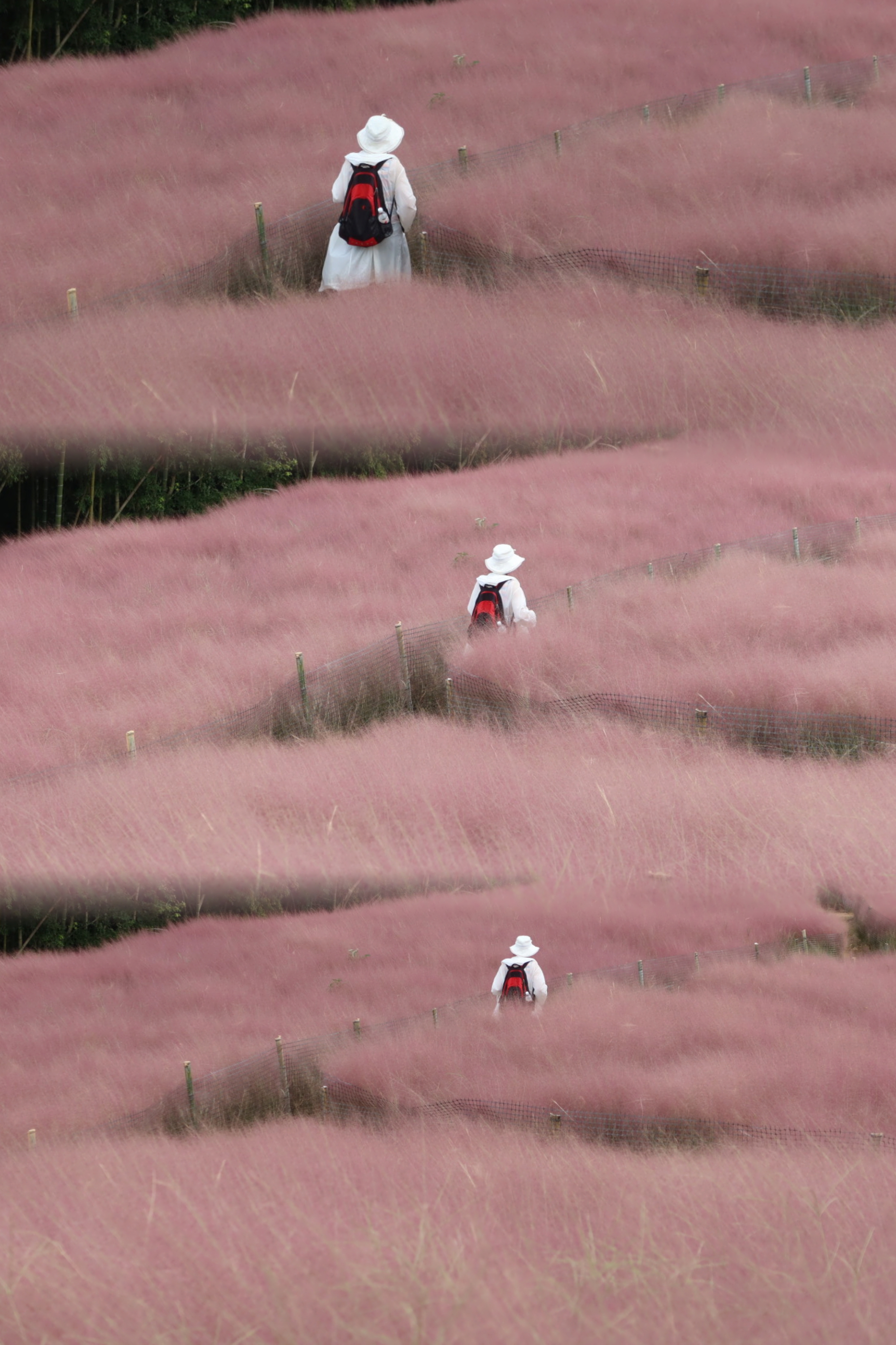 我继续赶路,急着去和传说中的粉黛乱子草约会。一大片粉紫的云雾在山头上隆起,但颜色不甚鲜明,柔和而略显黯淡,好像对于前景并无多大信心但又不至沉沦的那种生活的底色。偶尔有一枝狗尾草混杂其间,使粉雾开了绿色的缺口,倒显出了不一样的生机。在栅栏以外的山坡上,粉黛乱子草便开得涣散,聚不成云,有些还是青绿,也就由着圆头圆脑的博落回穿插其间,大少爷一样地吆三喝四,自己则如仆人一般面目模糊而温顺。人们热烈地涌向花海,在无风也看似荡漾的微波中留下自己的身影。走走跳起狂放的尊巴舞,那数不清的花穗就成了热情的观众,时不时地往一边倾倒,以示仰慕。草帽和白裙子是雾海中最素净、优美的航船,大家都说,“好像在宫崎峻的动画里!”但,是风中摇漾的花海和草浪先打动了宫崎峻。一只灯蛾没有扑向那团云雾,而冷静地栖身栅栏之外,只轻轻抓住一穗粉黛乱子草,似在专注地吮吸着什么,肥长的身子黄白相间,缀以几排黑斑,在布满黑白条纹的翅翼下轻微地起伏着,也如雾海孤帆。边上一只黄色的菜粉蝶则亮晃晃地飞出那团云雾,不沾一点颜色出来。天上大团灰白的云正虎视眈眈地盯住山头的粉云,“哼,还好意思假装成云,等我下一场大雨给你浇个透,看你还能不能像这样粉扑扑、毛茸茸的!”可是预报中的雷雨一再迟疑,终于酣畅淋漓地出场时,我们早已坐上了返程车,那是后话。总之,我们遇上了晴好的时刻,清晰地望见象山港,虽然海天之间的边界被比粉黛乱子草还要浓稠的云给遮掩住了。