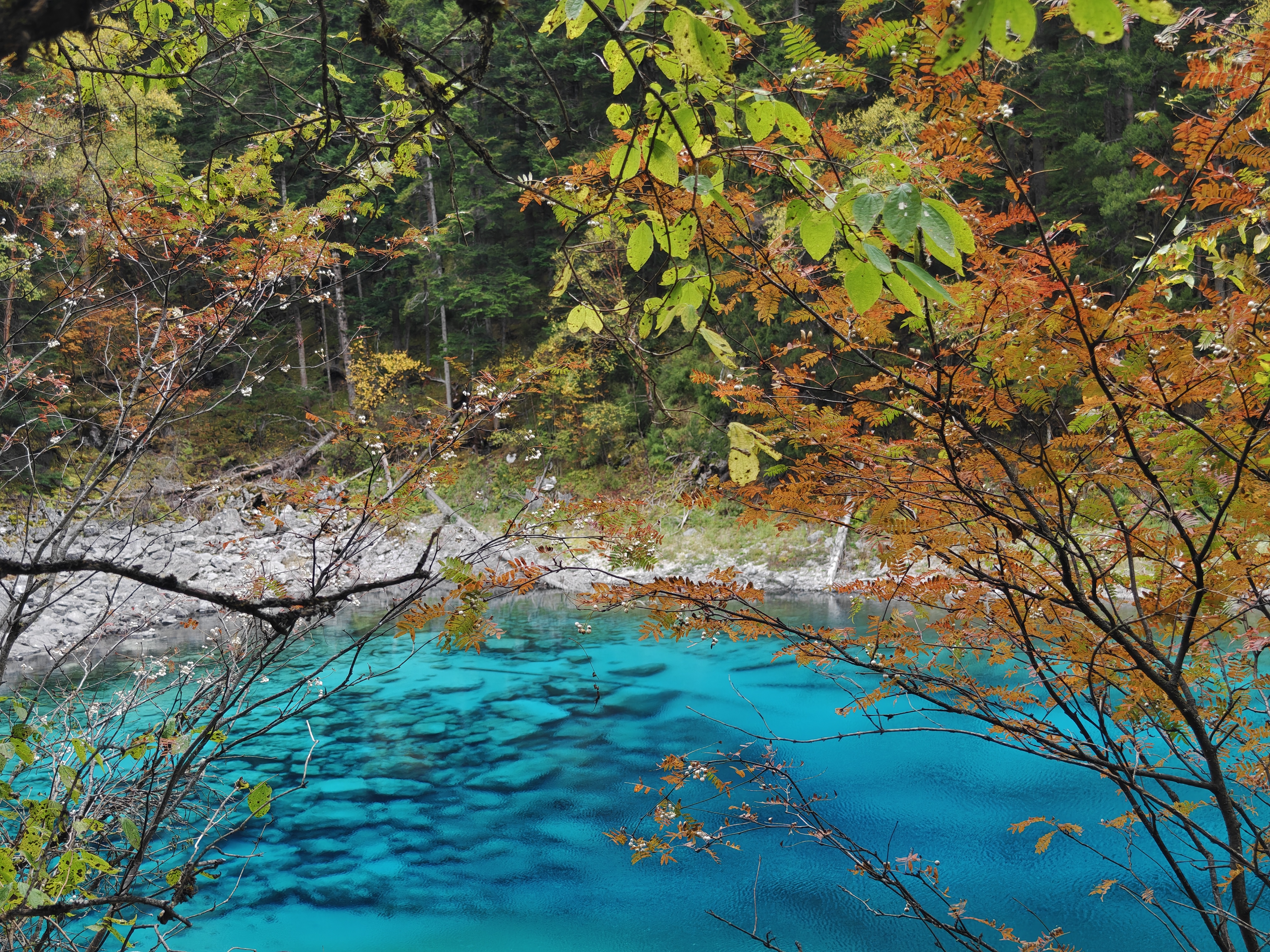 【五彩池】是九寨沟湖泊中的精粹,湖里生长着诸多水生植物群落,在富含碳酸钙质的湖水里,能呈现不同的颜色。同一湖泊里,有的水域蔚蓝,有的湾汊浅绿,有的水色绛黄,有的流泉粉蓝……变化无穷。
