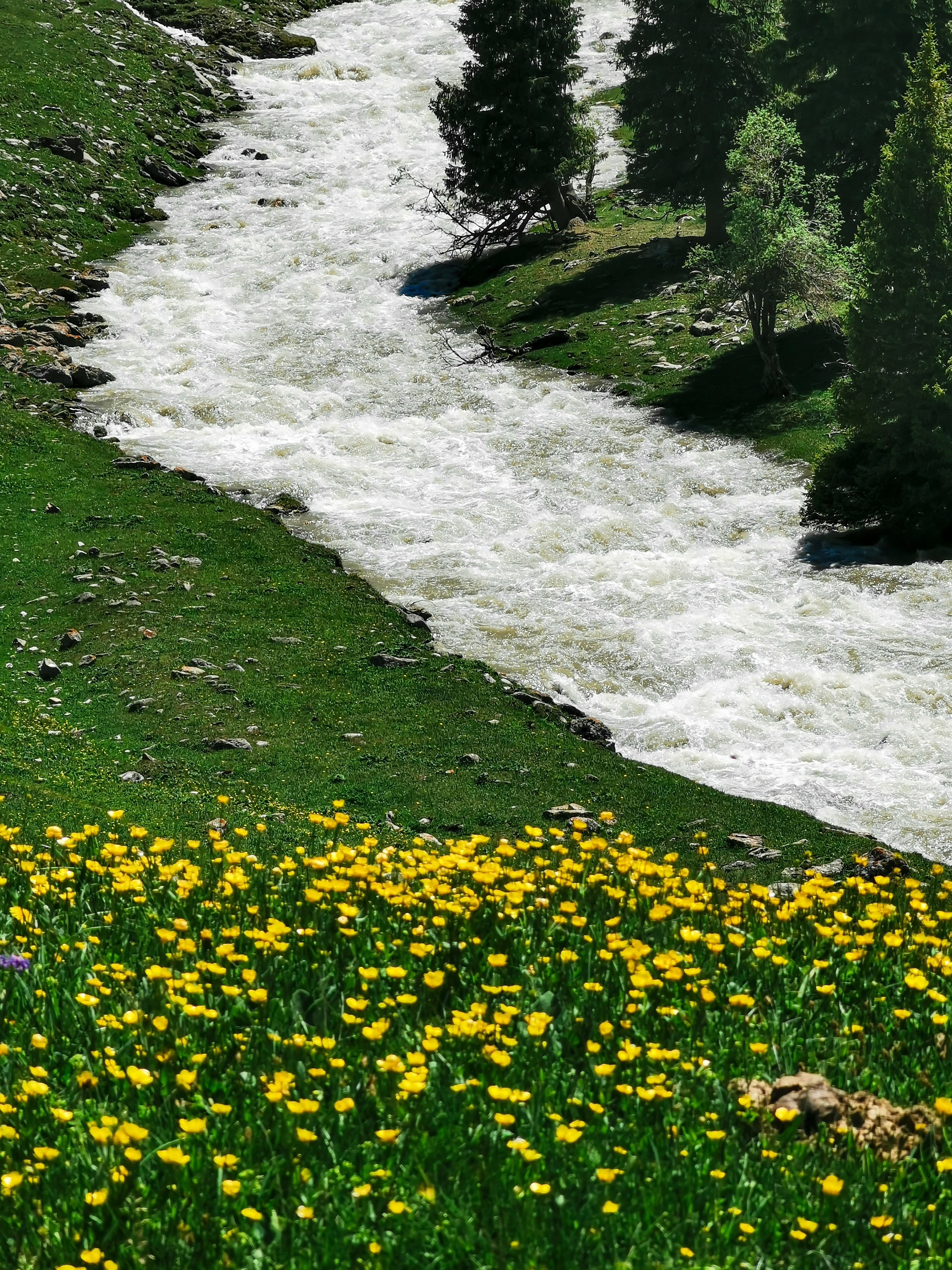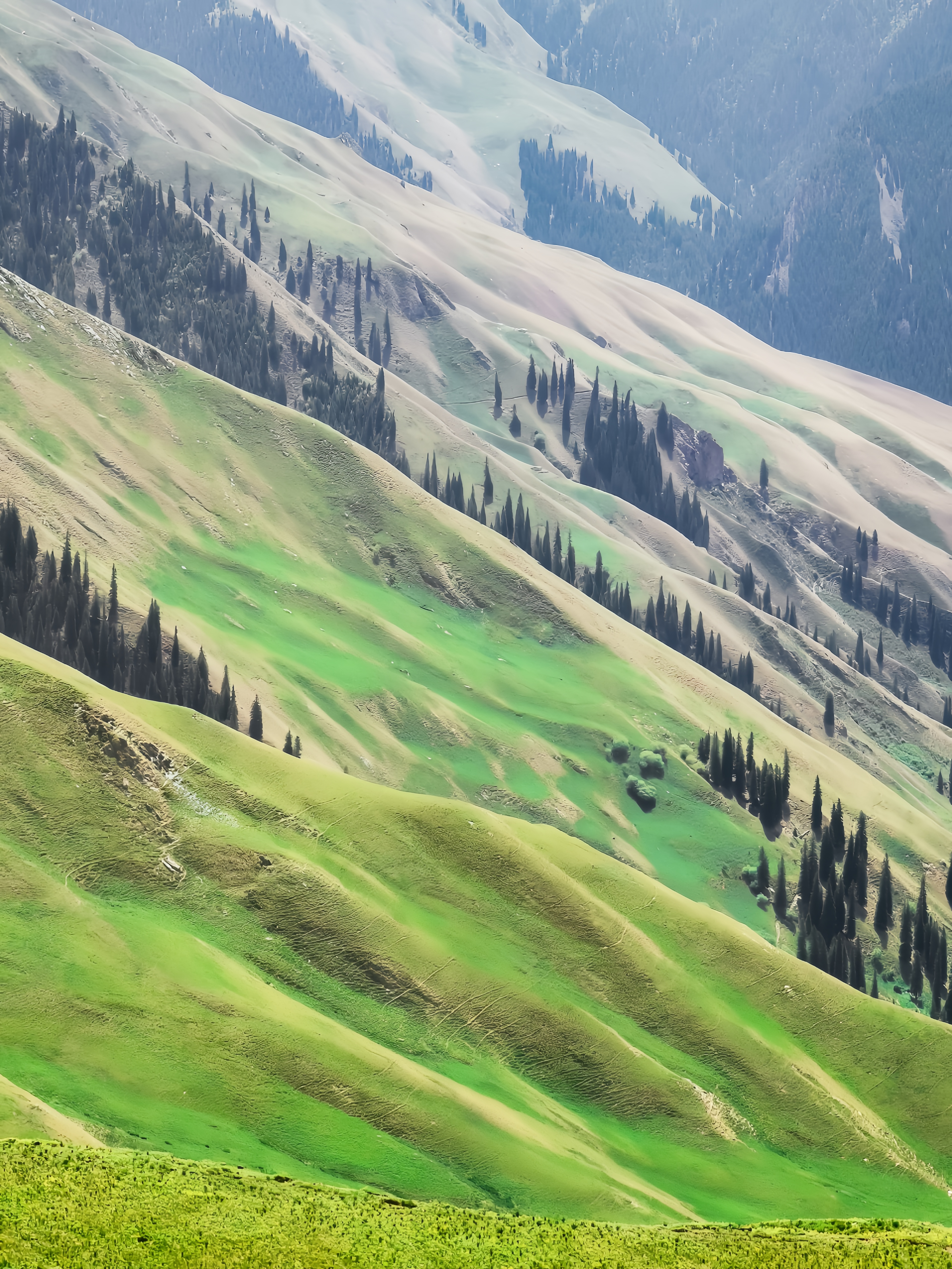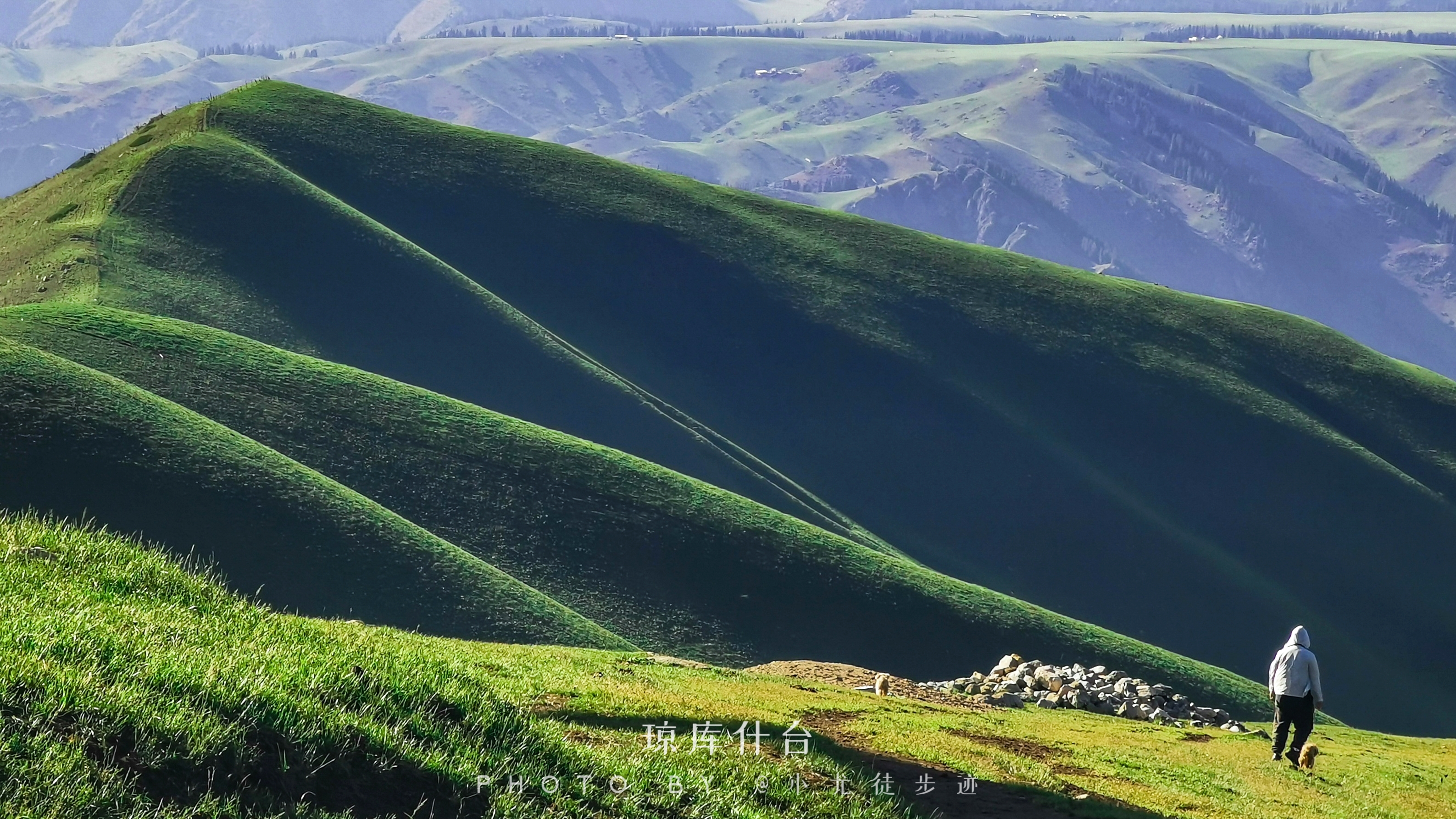 如果说南疆是野蛮生长,那北疆就是草长莺飞。当绿色的山坡映入眼帘,随之“绿色海洋”和画卷里的连绵雪山也来到了我的眼眸里。
