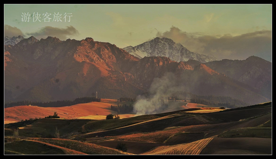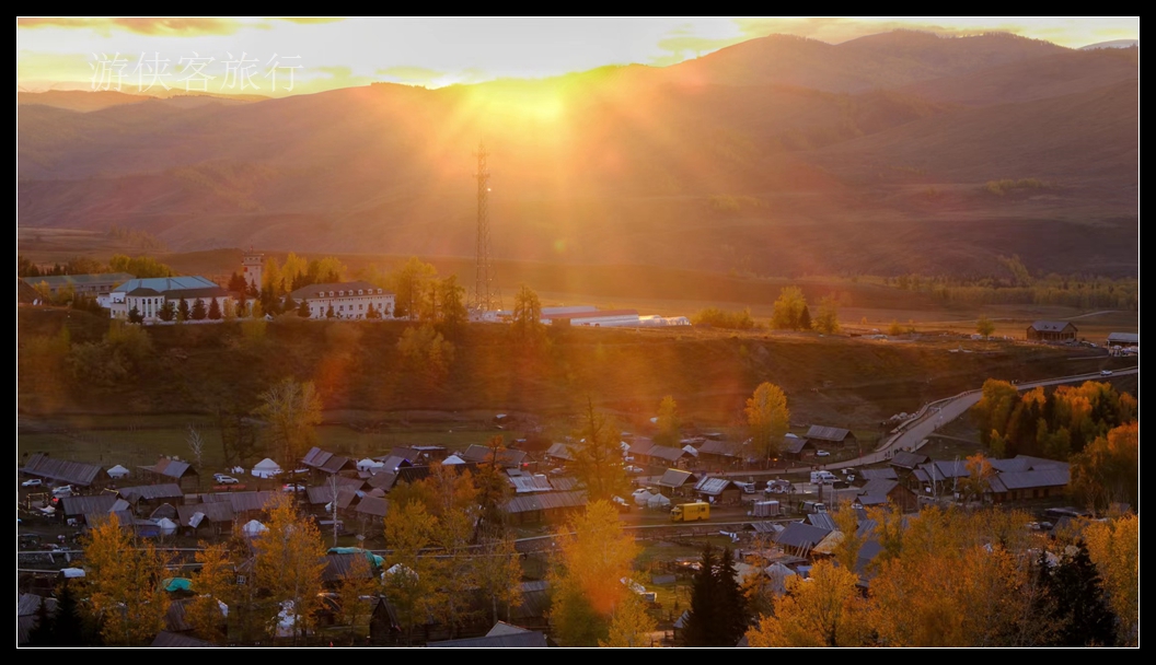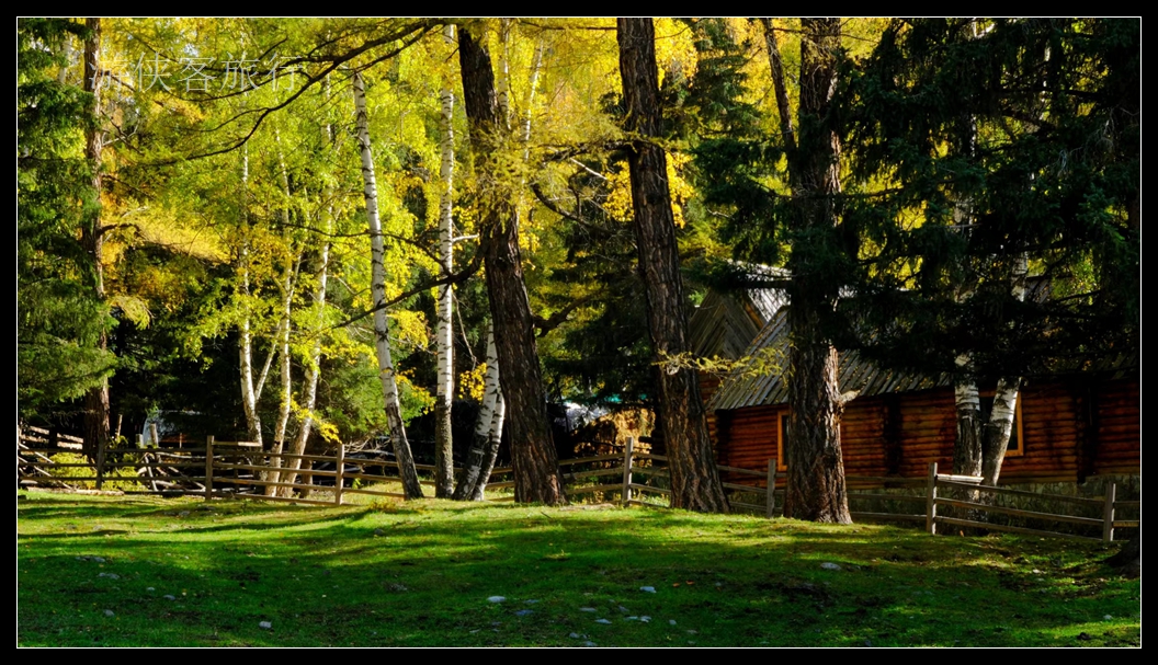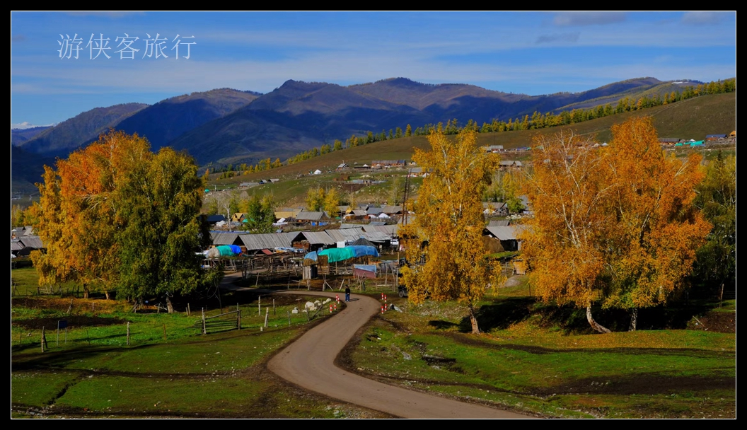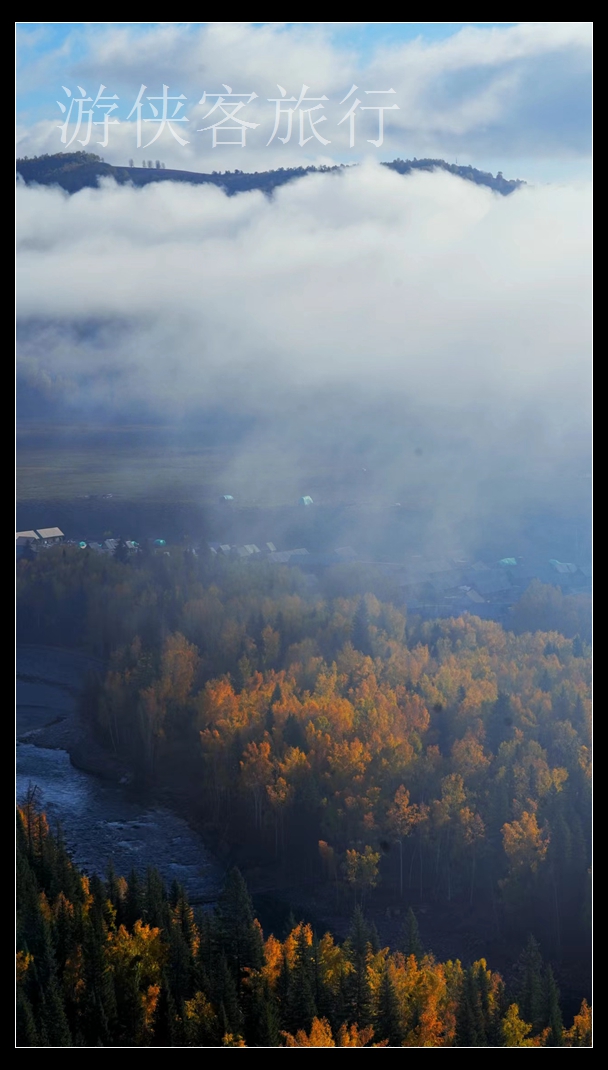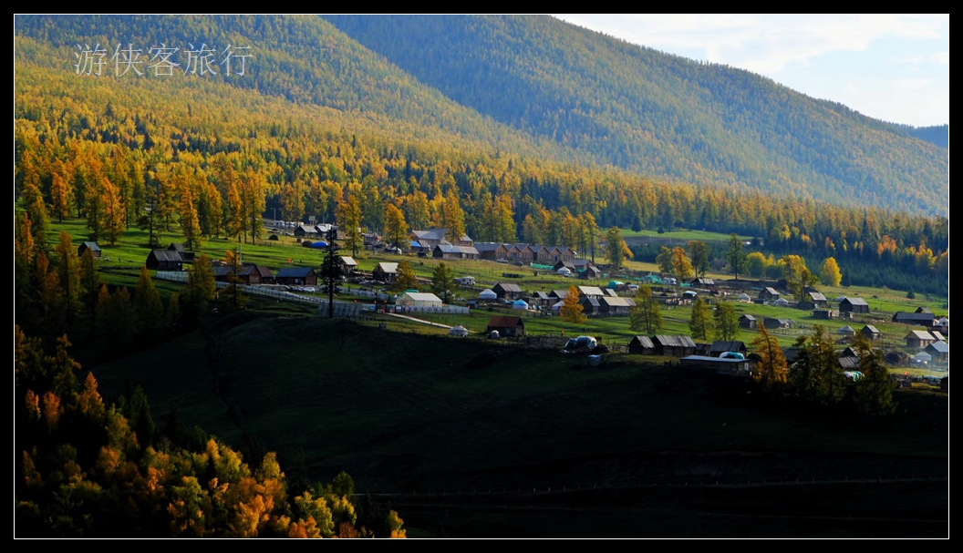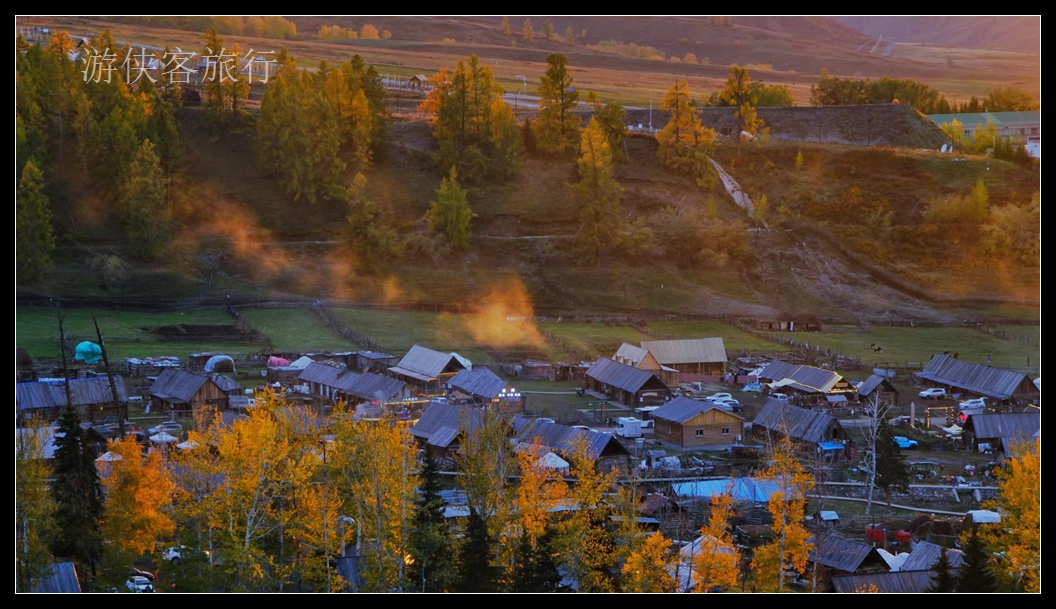 这里距喀纳斯湖大约70公里,周围群山环抱,生长有丰茂的白桦树林,是一个美丽的北疆山村。登高望远,秋色浓烈,几缕云雾牵挂在林中,坡下是分成高低两层错落的村舍,又有白桦林的树梢作为前景宏衡,禾木河在桦林的掩映中静静流淌,早晨的阳光柔和地洒在一栋栋的小木屋上,整个村子给人一种祥和的感觉。就如同一幅色彩斑斓的油画。