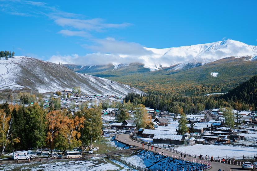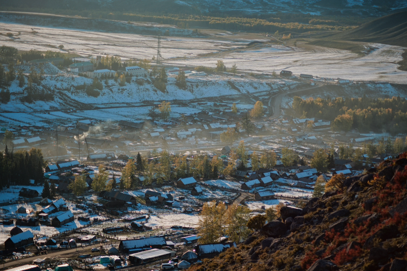 今年9月24日,北疆地区正式开始降雪,可可托海作为新疆的极寒之地,也在25号迎来了初雪,虽然山坡向阳面还会雪化,露出短暂的秋景,但随着天气越来越冷,北疆就迅速进入了冬季