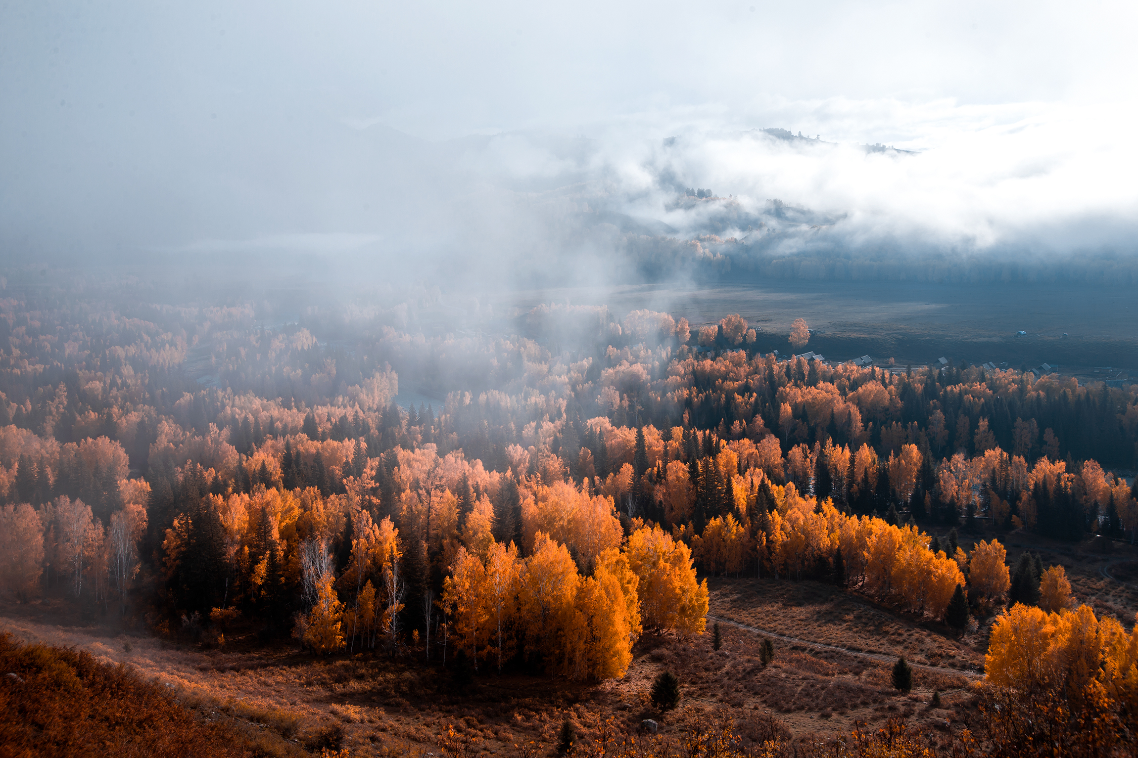禾木古村位于新疆布尔津县喀纳斯湖畔,作为图瓦人的聚居地,禾木古村是仅存的三个图瓦人村落之一,也是其中最远、最大的一个,总面积达到3040平方公里。这里生长着珍贵的西伯利亚区系植物,如落叶松、红杉、云杉和冷杉,还有茂密的白桦林;灌木丛茂盛,枯叶朽木上覆盖着苔藓和野草,走出树林则是一片翠绿的草原;时有烟雾缭绕,远远望去给人一种神秘而壮美的感觉。来过禾木几次,每次都有不同的美,而今年的秋色比往年迟了约十天左右,国庆期间是最好看最美的。以下图片大多在哈登观景台拍摄,就不一一说明了,实在是图片太多。