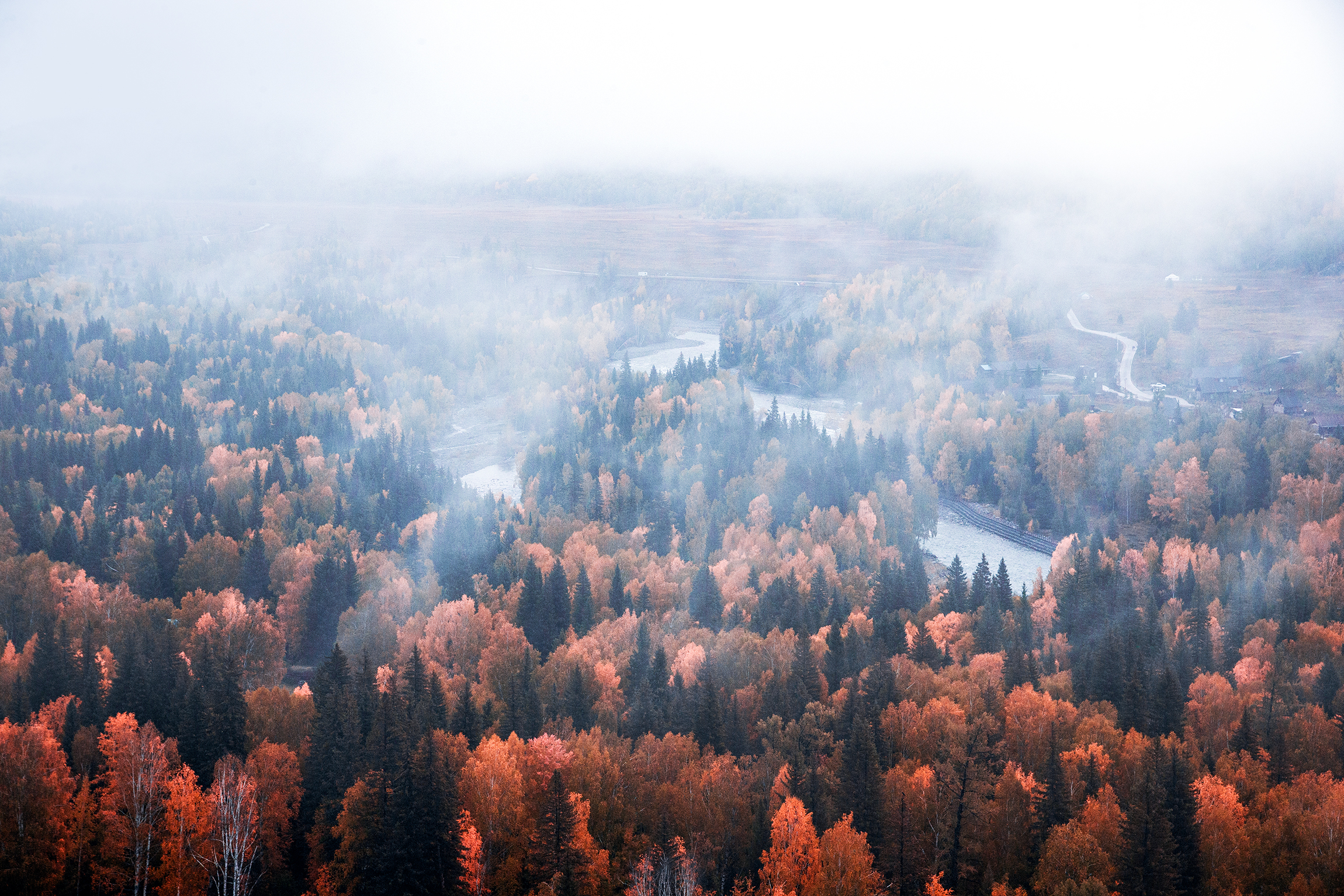 早上七点,我们就在禾木桥集合上山,那天雾特别大,白茫茫的一片啥都看不到,但是当无人机升高一百多米后就看到绝美云海和金黄的白桦林了。