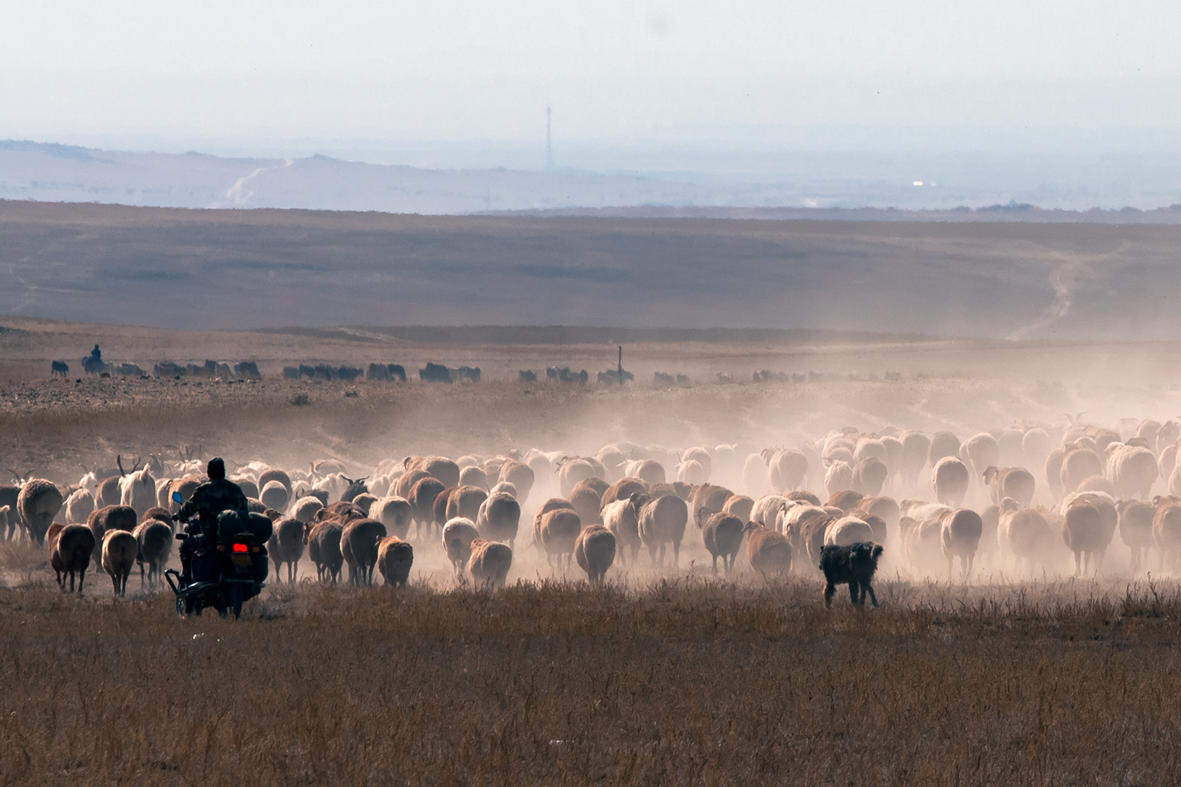 几乎像永恒的约定,每当季节变换,哈萨克牧民便开始浩浩荡荡地“搬”:夏季来临前从山前平原搬到深山里,秋季结束后再从高山回到河谷低地。恰逢秋日最美季节,在广袤原野上,我追逐着哈萨克族世代沿袭的迁徙场景。迁徙大军连绵不断,百万牛羊、驼队、骑马扬鞭的牧人都是转场风景,构成一幅幅颇为壮观的重彩油画。