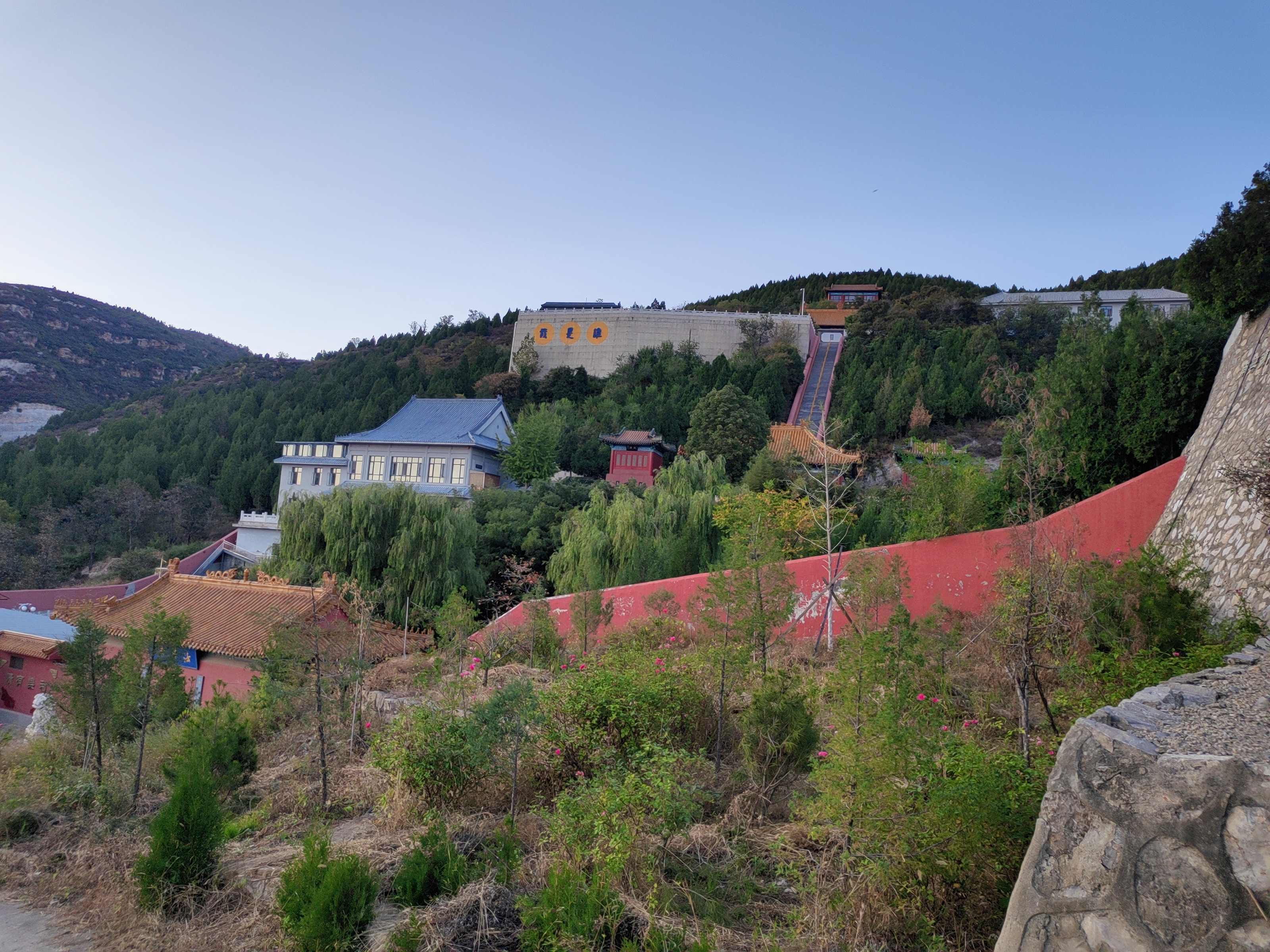 登80级台阶到天王殿,感觉不会走回头路,按照一个平台绕行完再上一个平台。再登 209 级台阶到大雄宝殿大雄宝殿左边是祖师殿和禅堂。藏经楼左边登一百多级台阶到万佛铜殿。走小路下山,通往祖师殿。祖师殿是原寺院遗址位置。