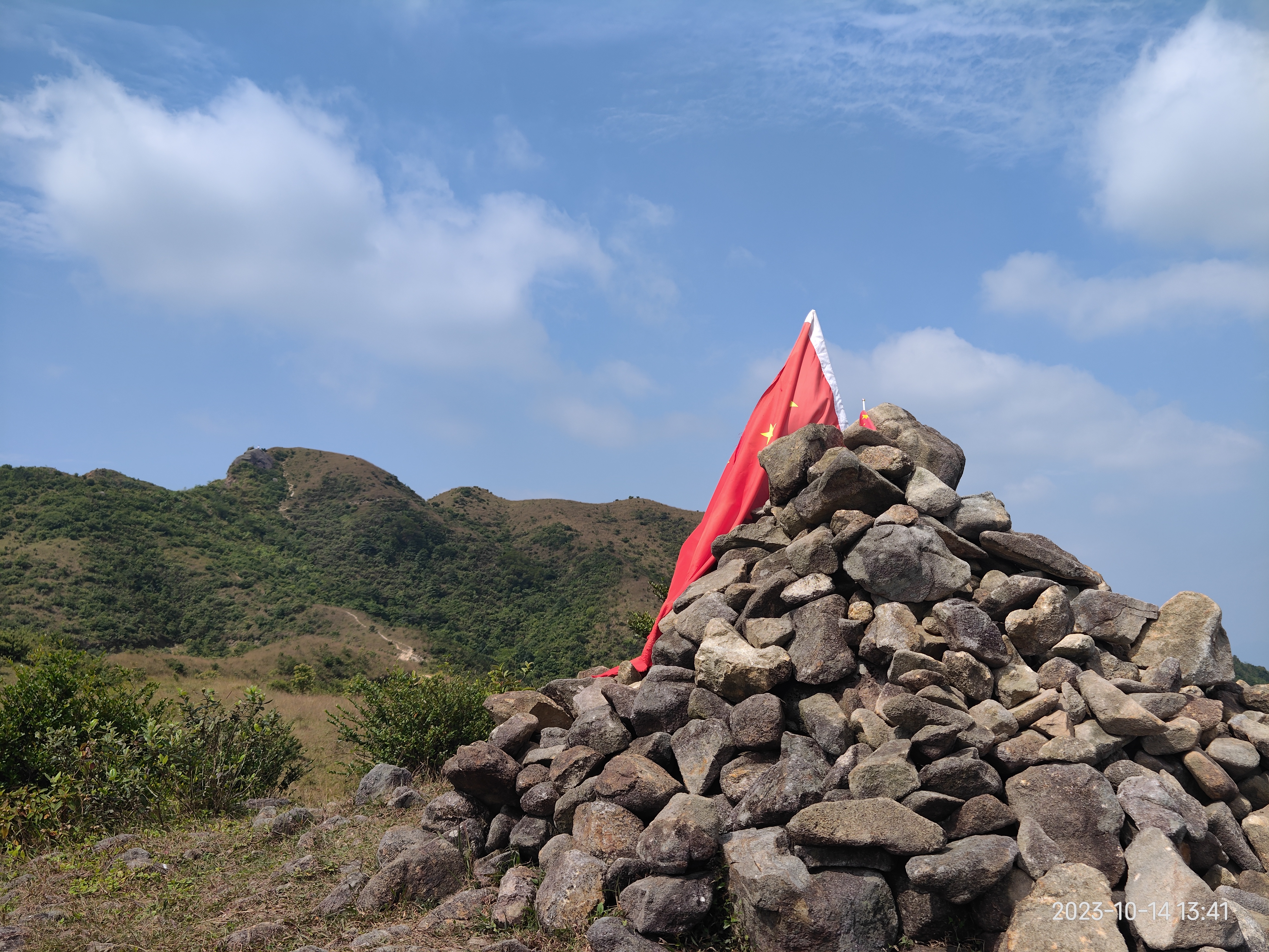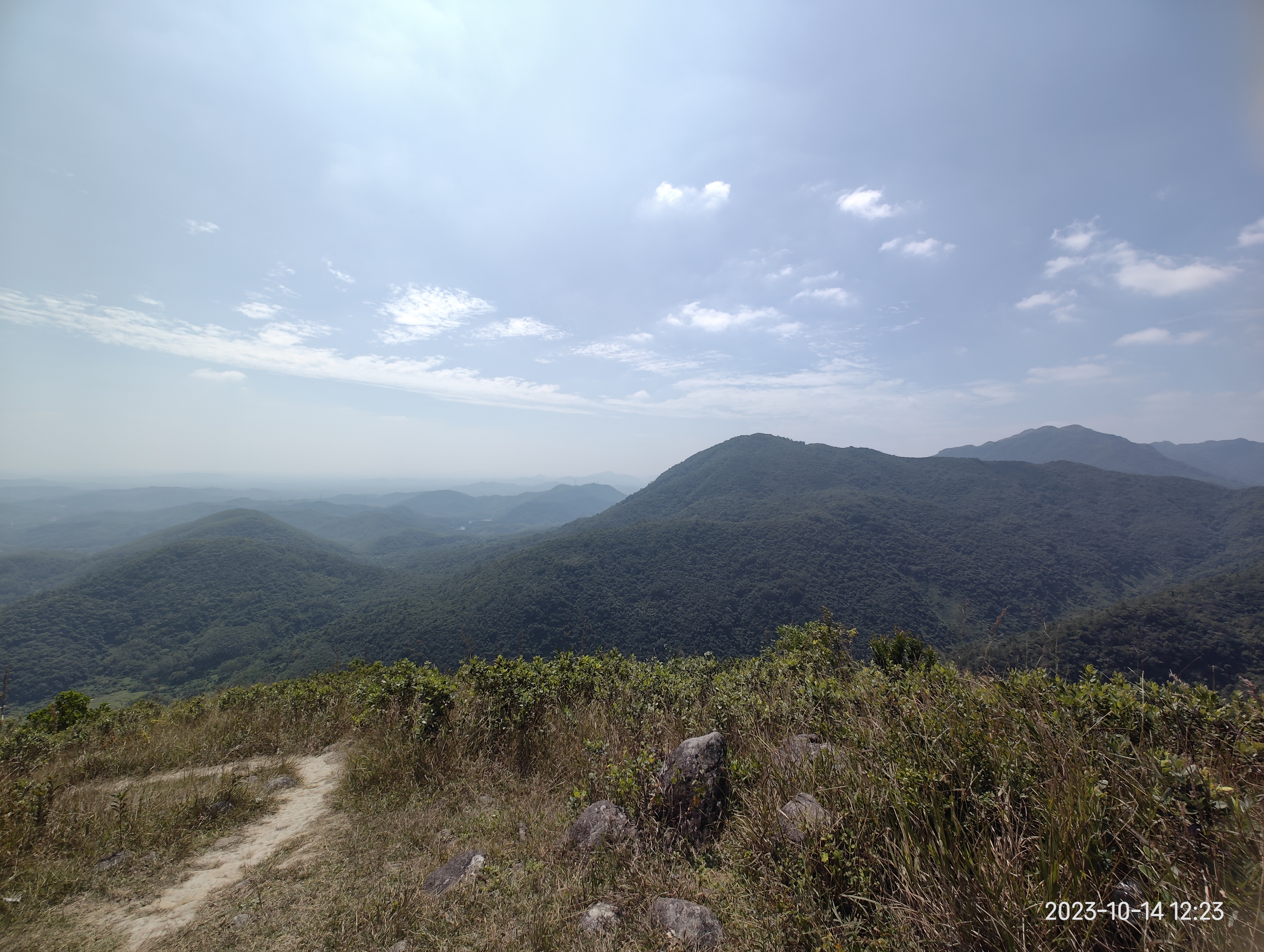 开始在树林间小路爬坡,路面好走,可踩着树根形成的台阶,一路往上,偶有石头。升至四百三十米左右,用时三十分钟,便能走出树林,视野变得开阔,背后可远眺山下散落的村庄,和片片田野,前进方向两侧是群山。接下来,沿矮草木丛小路继续爬升,脚下多是石头,得注意。之后一路行走于草甸之中,小径清晰。秋季干燥,云量较少,头顶是湛蓝天空,和无遮挡的秋日,好彩有秋风送凉。再走二十分钟,五百一十米处,有圆润的山丘平台,环境舒适。时间已是十二时四十分,于此坐地午餐。此处可欣赏四周连绵起伏山峦,金色草甸,蓝天薄云之下,更显秋日景色之美。休整后,继续前行,不断翻越起伏的山丘,而彼此落差不大,坡度平缓。在这似乎不会迷路,可自由自在地轻松行走,缓缓上升。到一分叉路,得注意。左面是通往另一高峰大脊,穿越线方向。而右面则往大石头山顶,本次往返线的到达点。这大石头山顶,海拔七百米,一侧为断崖,另一面有巨石,可站于上方拍照,背后风景秀丽。值得留意的是,路上有甚多牛粪,可能村民放牛到此,是否牛塘山得名的原故?回望刚走过的山陵,就如一片空中平原,金黄草坡的山脊。这里被形容为广东版小武功山,确实如此。而这里,更容易触及,难度不大,海拔才七百米,易于行走。