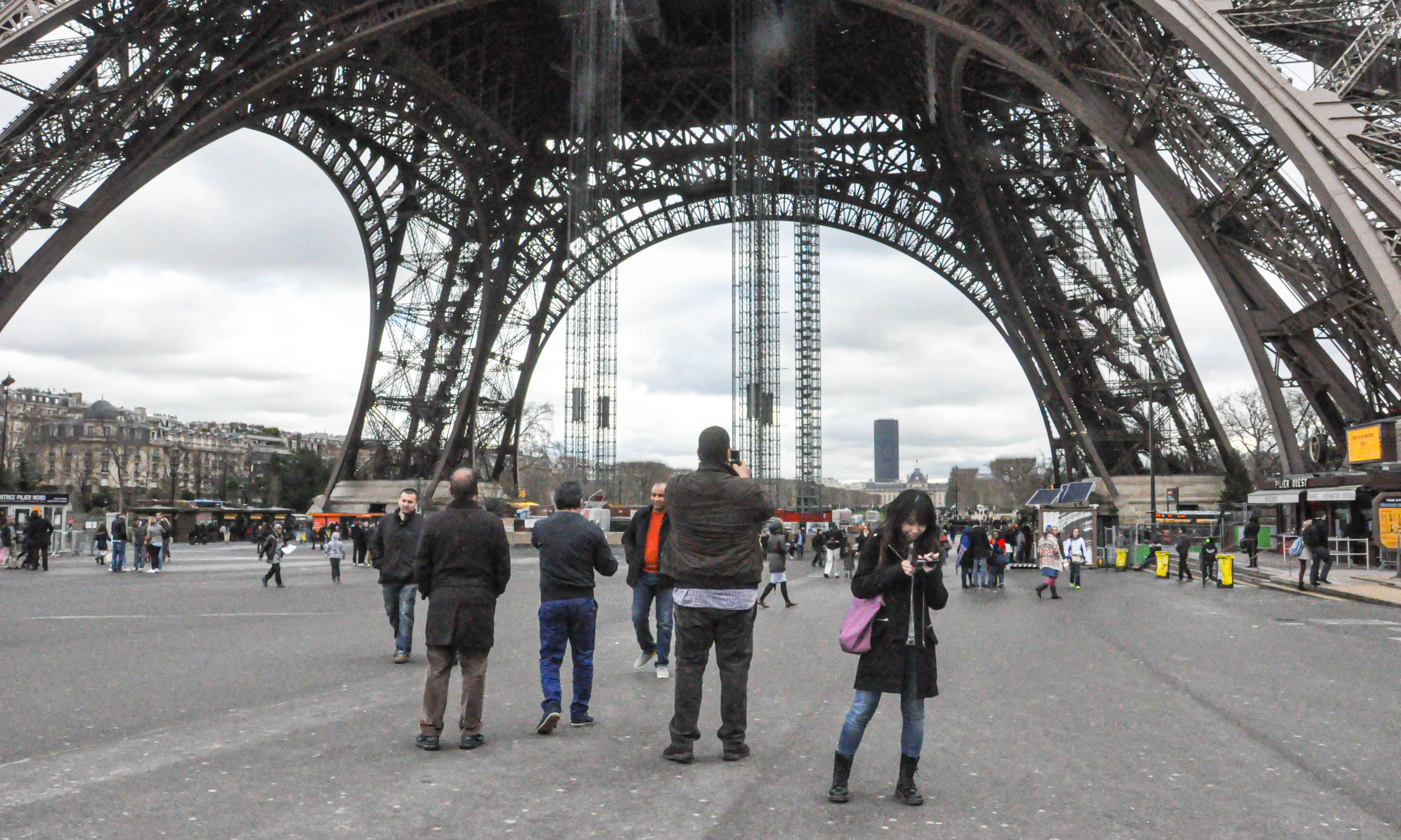 上一张铁塔细节图,爬上去的楼梯都在四个塔脚里,埃菲尔铁塔建成于1889年,是一座为了世博会而打造的金属镂空结构建筑,据说当年是埃菲尔模仿着人的小腿骨而建造的铁塔,并考虑到铁塔受到的风力要在可承受范围内。