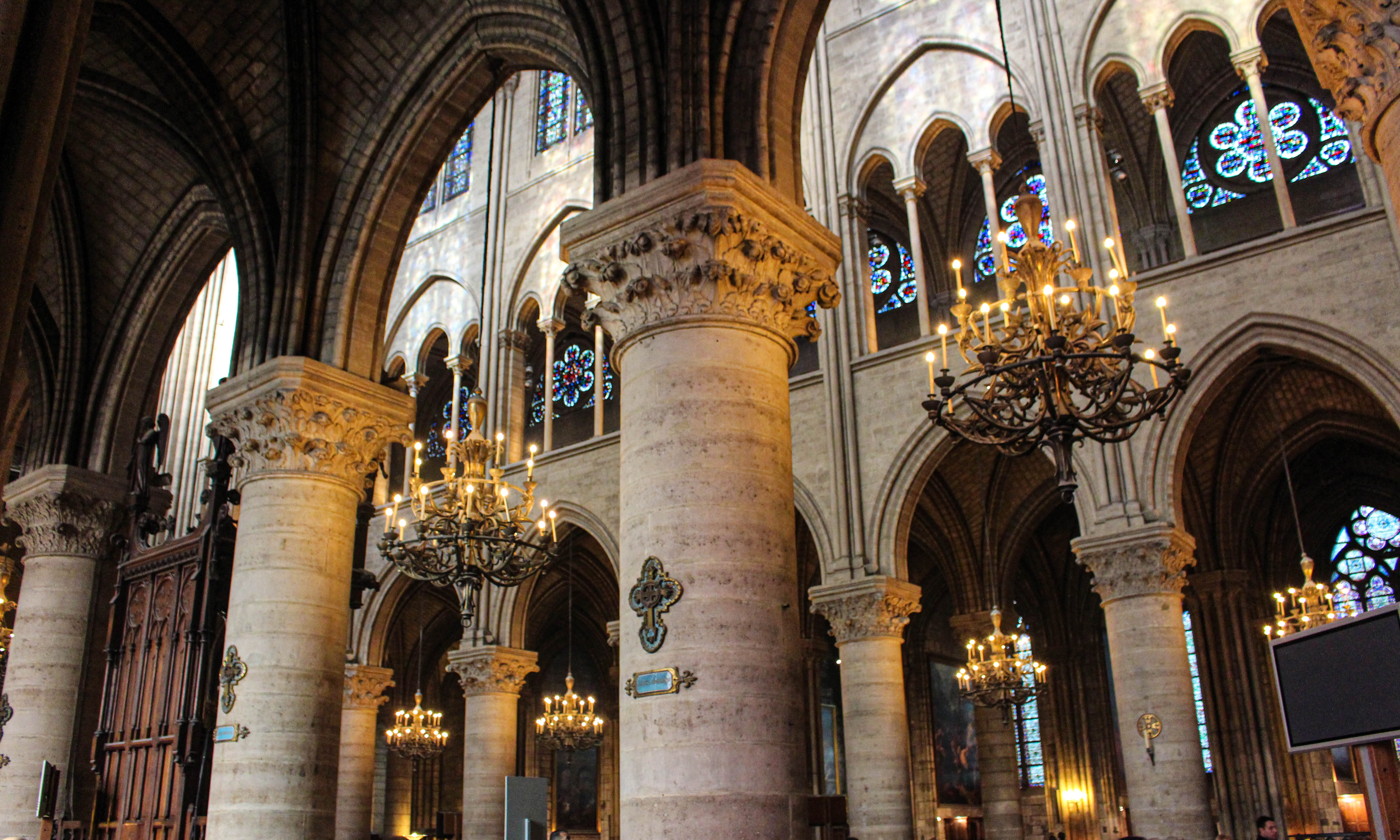 一进入圣母院就会看到右侧的大铜十字架,这座铜十字架是由拿破仑三世赠送的,虽然这座铜十字架和哥特式的教堂稍微有些显得格格不入,这却说明了圣母院的历史的确是非常悠久,圣母院一直是法国历史的中心,并永远长存及活跃于巴黎教会的生活中。
