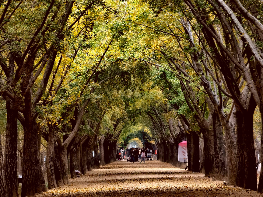古银杏姐妹园+银杏时光遂道。叶子半青黄,还没落但叶子边缘已经开始枯萎了。