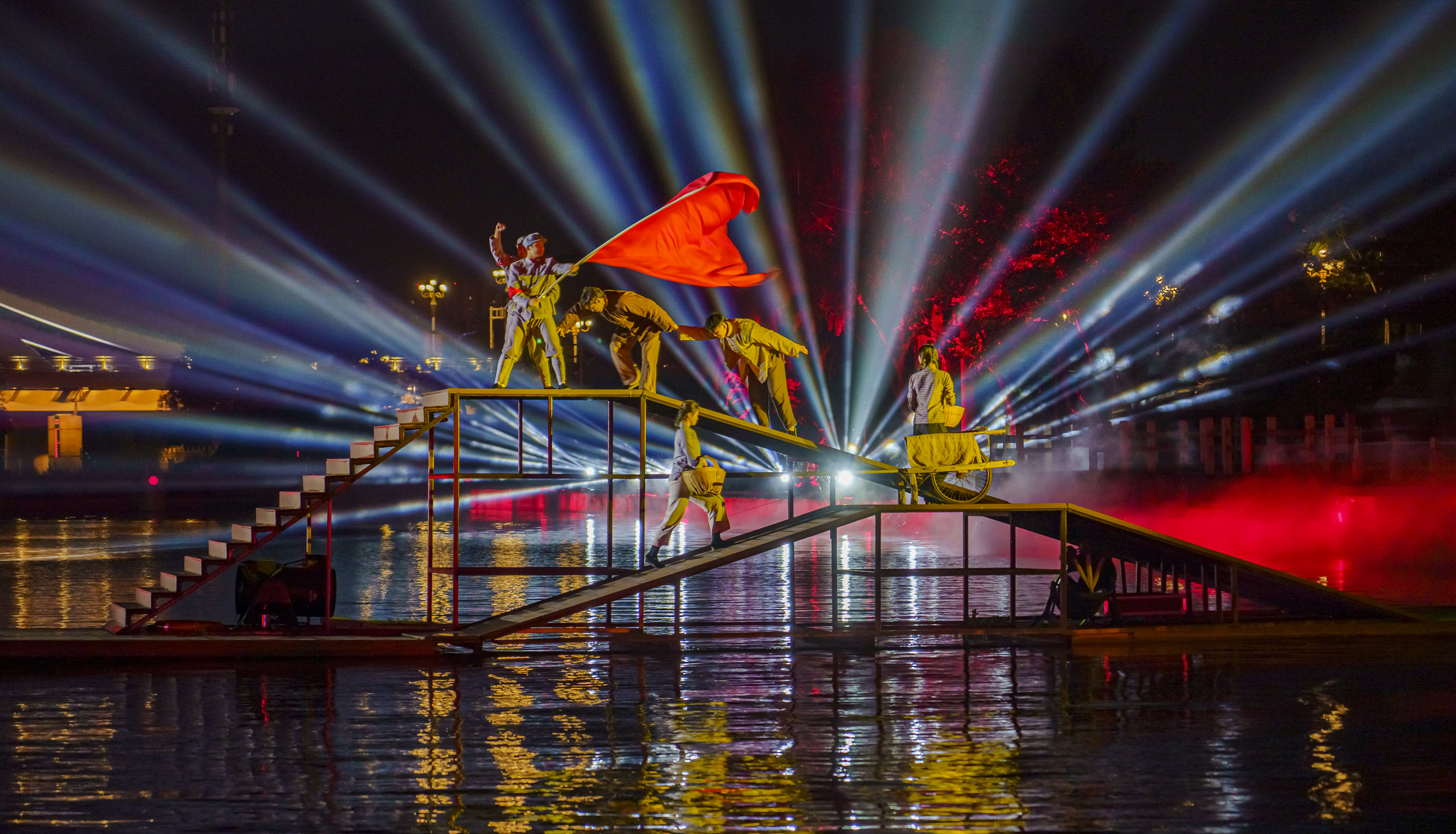 游船开动后会在桥边停上一会儿,方便大家欣赏激光水幕,然后再穿过桥洞,一路欣赏历史画卷、凤凰于飞、舞蹈表演、算圣刘洪、书圣王羲之、颜真卿、智圣诸葛亮、沂蒙红色精神,涉及人物的表演都是真人实景演出,还有光影、水幕、火焰等现场效果配合,非常震撼。