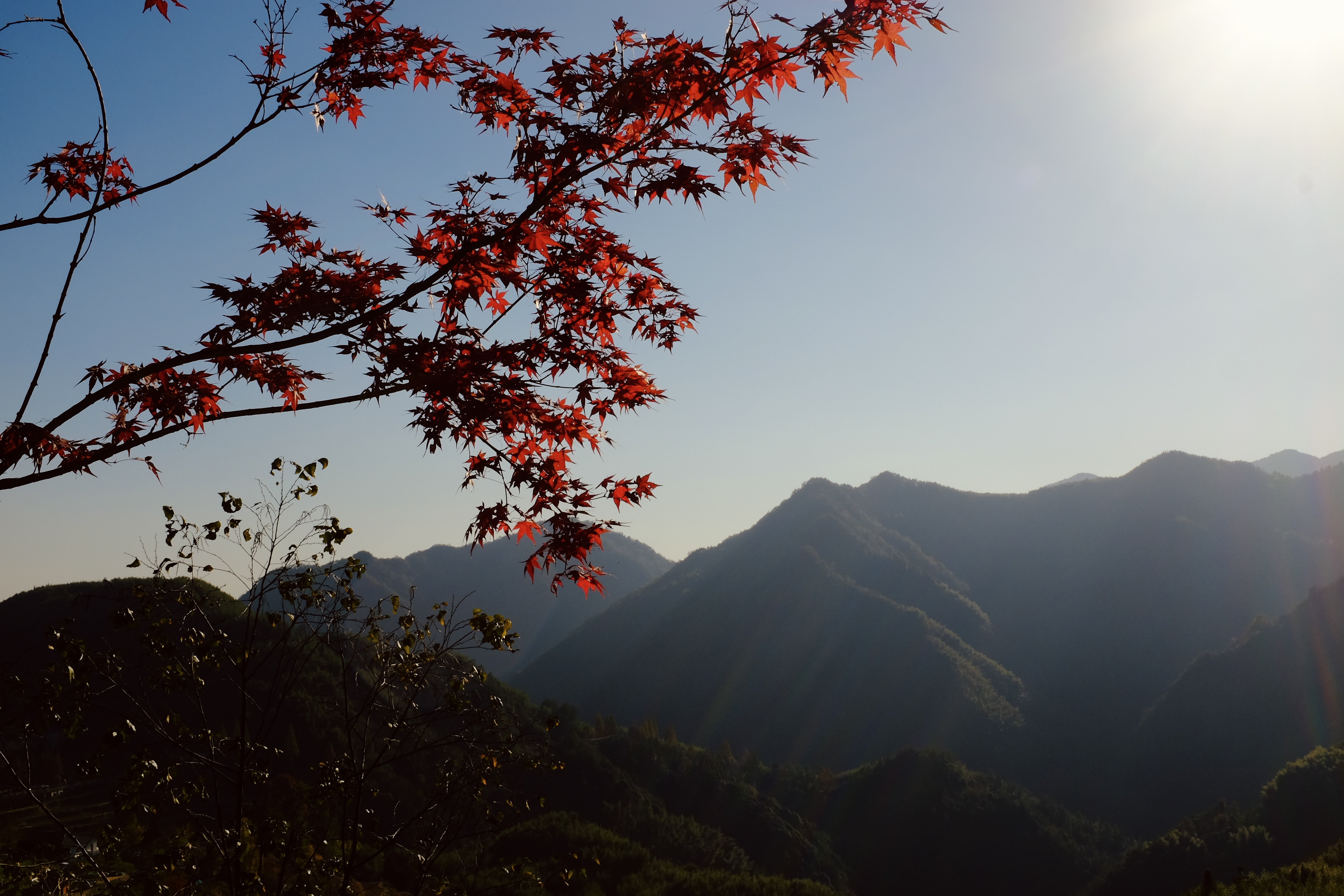 一路往上,金黄的银杏叶、火红的枫香叶、巨大的香榧树,在山道边随风摇摆,仿佛热烈欢迎着我们。