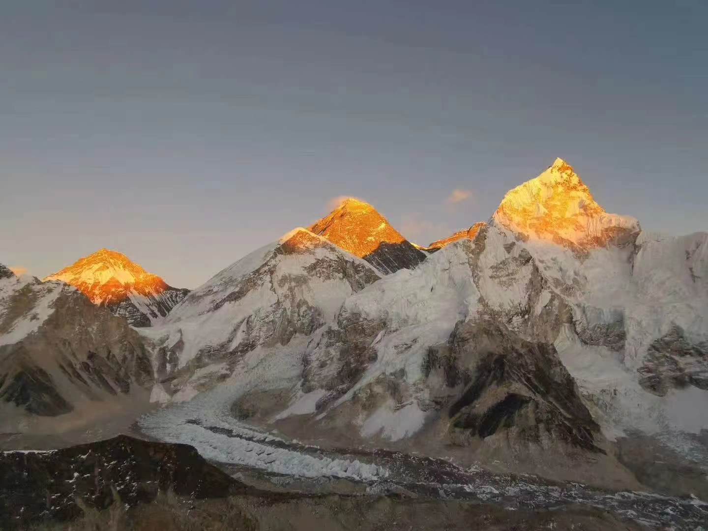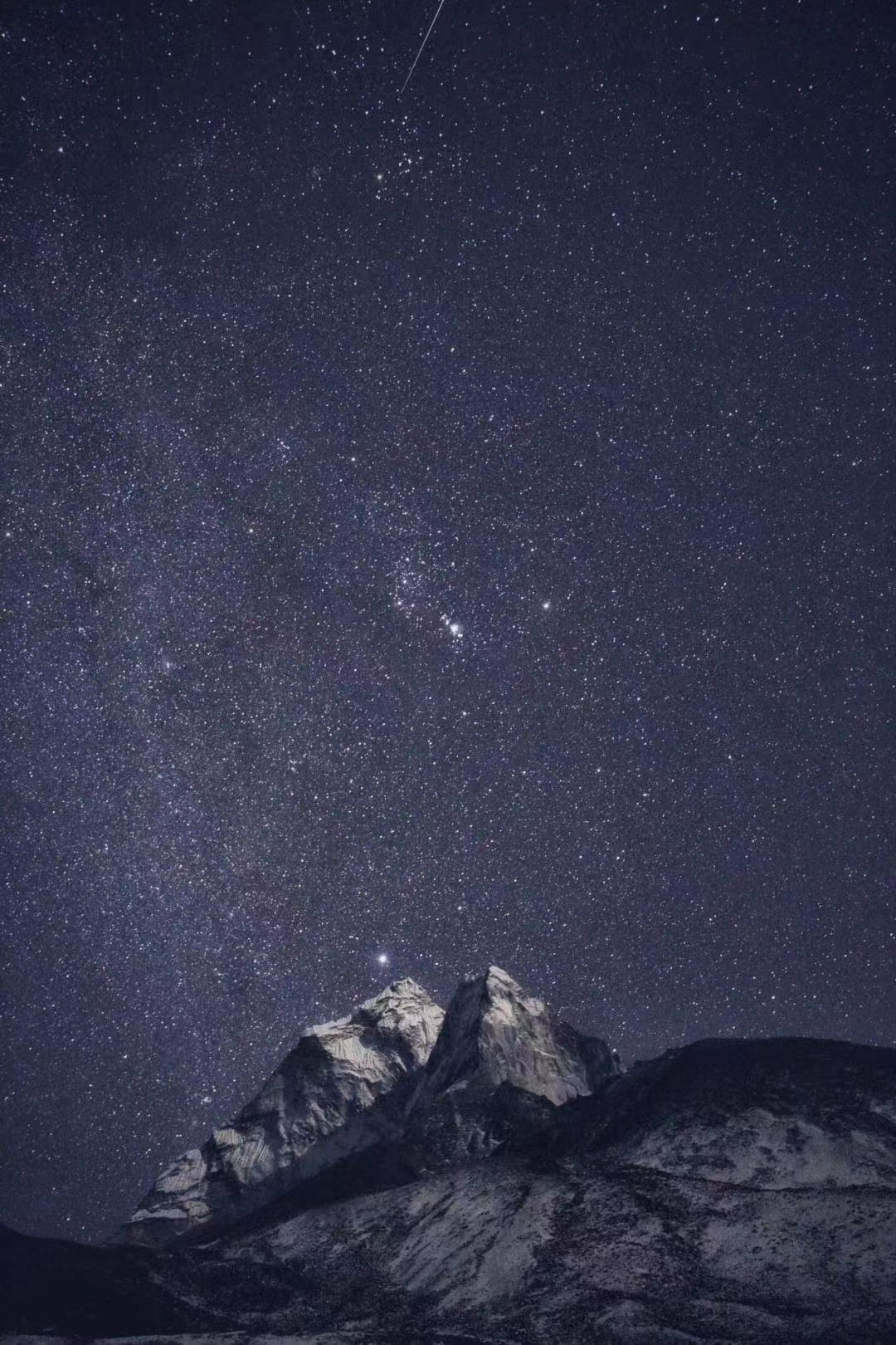 2020年尼泊尔EBC途中,阿玛达布朗雪山顶上,猎户座缓缓升起,还抓拍到半截流星。