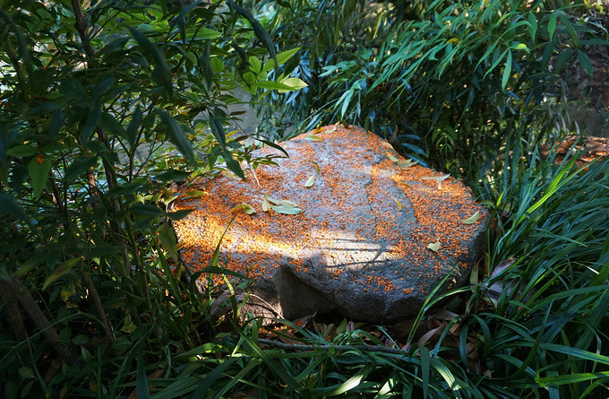 有室内和室外两个用餐区,室内就是这种装修,比较古朴厚重,有个天井,秋天刚好,夏天可能很热。我们在室内吃的。其实室外也很好,就在边上的桂花园里,只是边上就是马路,我们一开始怕有汽车尾气所以选了室内,其实室外都用绿植围好的,也不错,桂花随风飘落,会飘进菜里,更添风味。