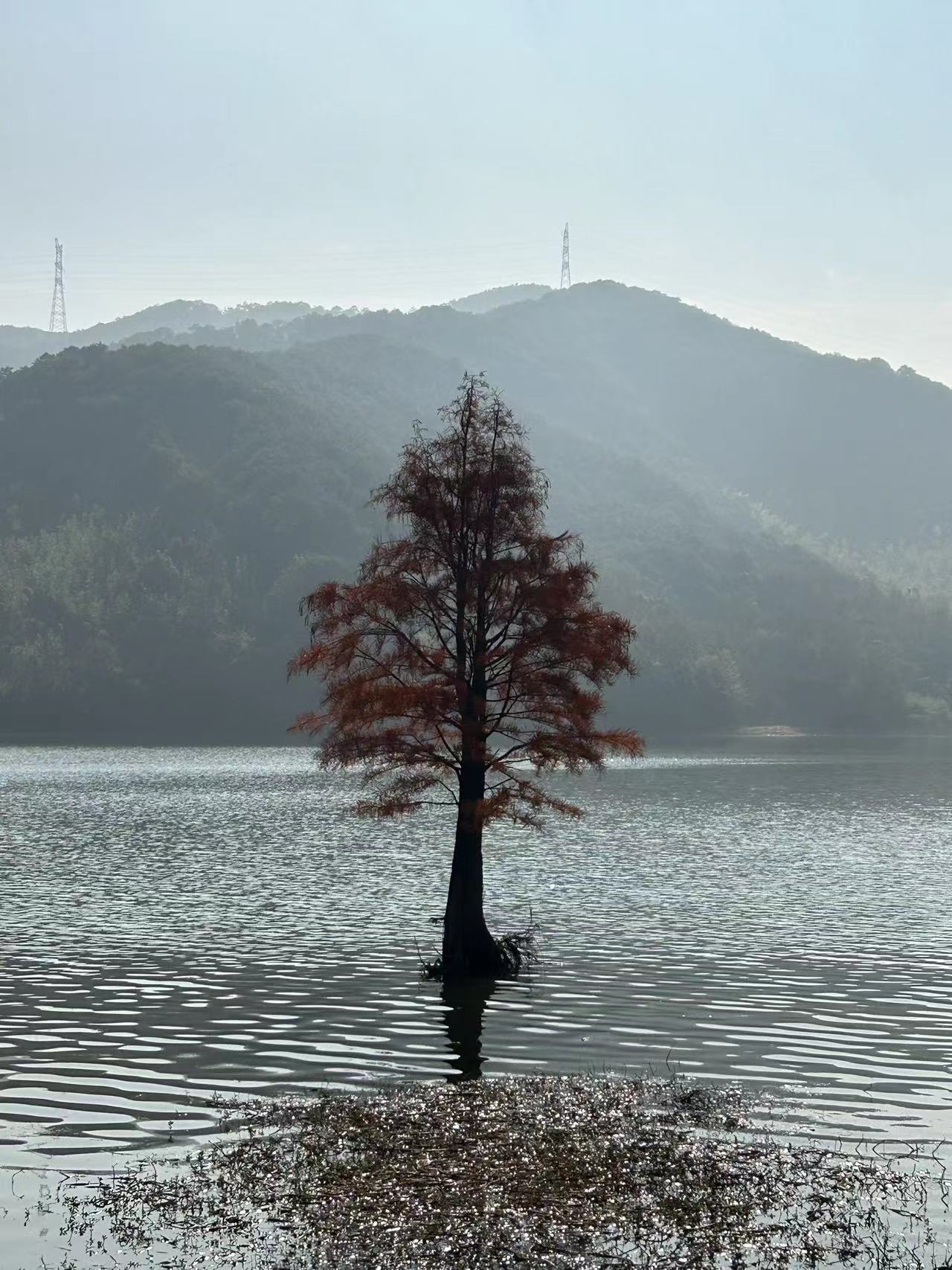 在石井水库的大坝底下,一株高大的水杉顶天立地,颇有盘古开辟鸿蒙般的气势——云不过是从它的树冠里孵出来的;地是一头苍黄的巨兽,完全被镇在脚下。然而这雄浑的神话露出了一丝显眼的破绽,树下有座厕所(众人还纷纷嫌弃它肮脏,不像我这历经新疆、云南、西藏、内蒙古旱厕的老江湖那般淡定),这当即使我笑了场。对岸低矮的山林与自己的倒影连成两瓣灰暗的唇,仿佛属于一个疲惫、苦涩的中年人。雾霾笼罩着整片水域,太阳都昏昏沉沉的,只漏下一束柔细、灰白的光,似要掀开那不苟言笑的唇,却又被水吞没。此刻最鲜明的反而是岸上的山坡挡土墙,墙面如鱼鳞般闪闪发亮;墙下有几株铁锈红的落羽杉,则如喉中艳丽的鲠。一只深蓝色的小船也不甚明亮,但鲜活地搅起一圈圈涟漪,渔人撒下一个篓子。小菊说:“这是用来捕虾的,鱼进去了也不介意,反正都是死阵,破不了。”看来鱼虾们都没能修炼成江湖高手,虽然从小就混迹于江湖。我问:“那它叫什么?”小菊说:“我们那儿叫‘地笼’。”我说:“啊?明明在水里嘛!干吗不就叫捕虾笼?”