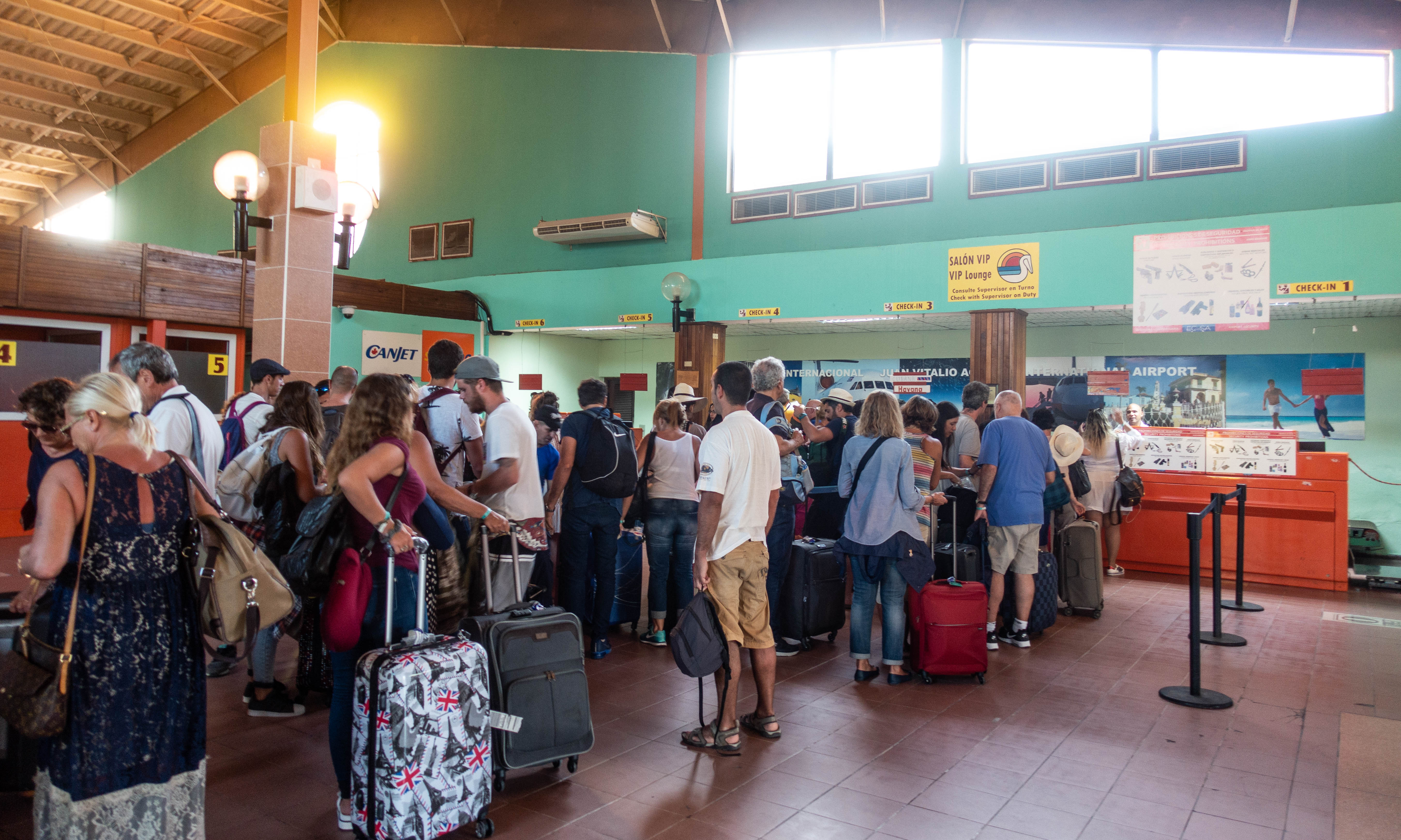 得知今天下午一点在Hotel Santander门口等旅行社大巴接,结果到了一点半大巴还没来,询问宾馆的另一家旅行社工作人员,大娘特别热心的告诉我别着急,因为大巴要接的游客比较多,迟到一小时之内很正常。快两点大巴终于来了,之后去别的宾馆接了很多游客,最后抵达久闻的巴拉科阿海滩机场,机场是古巴的军用机场,工作人员不允许拍照。