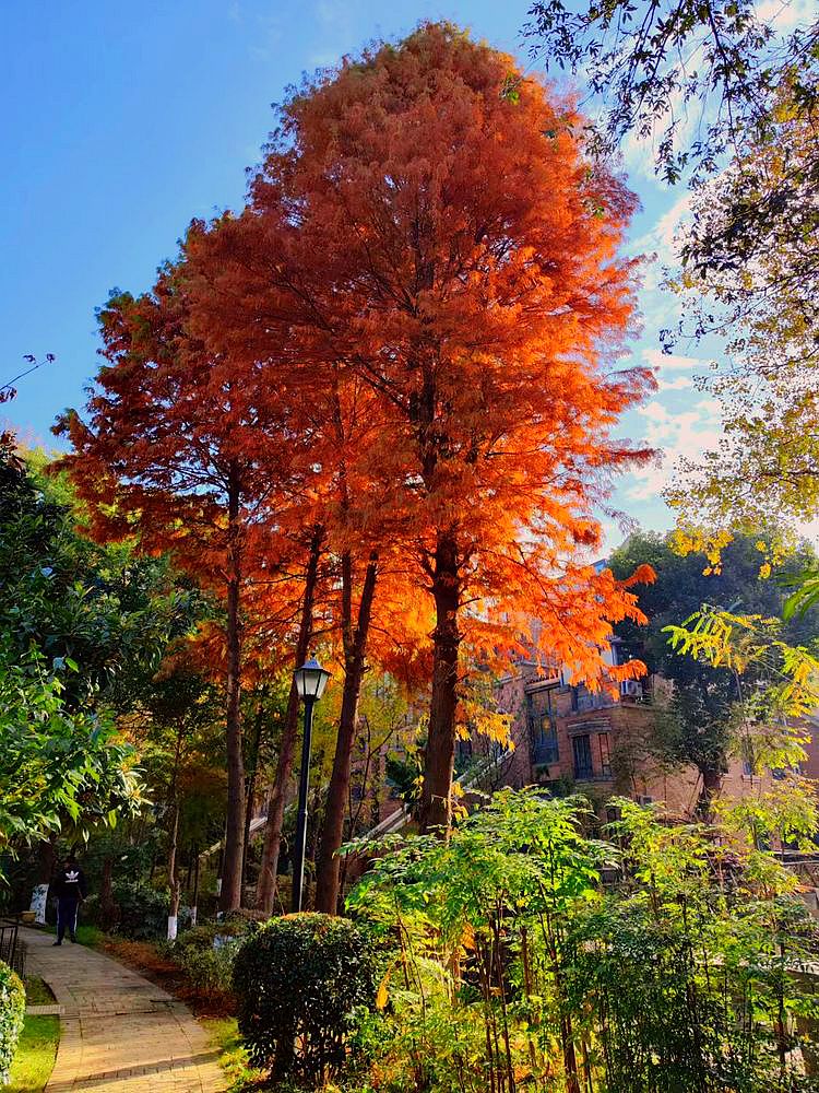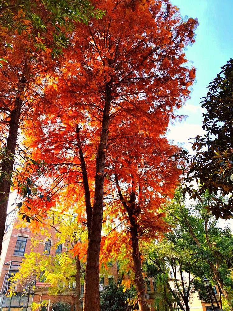 河道边,高高的柏树叶儿,被傍晚的斜阳照射,是鲜亮的橘红色,煞是惊艳!