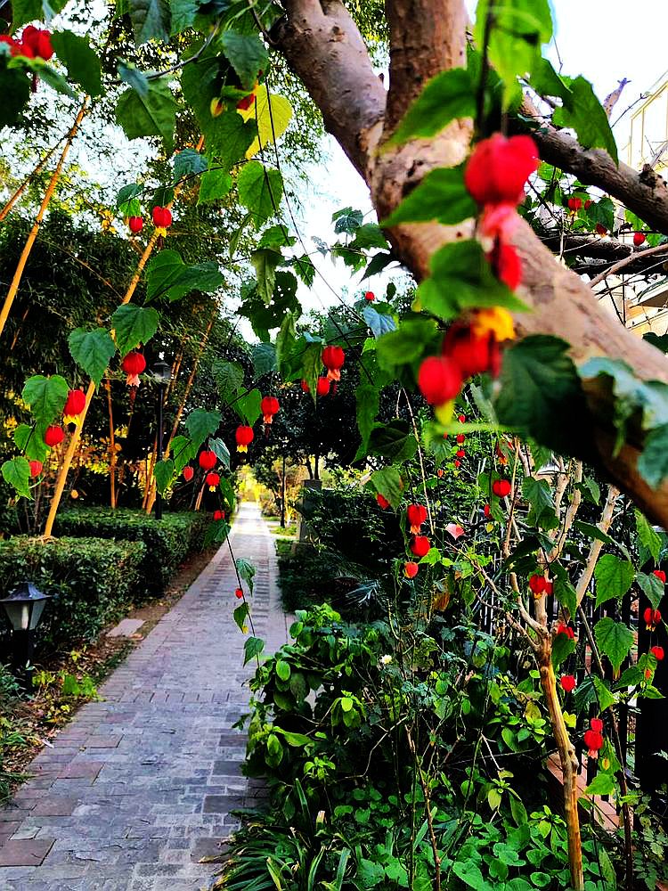 这小道边,伸出的“红萼茼麻”,花朵俏丽,如悬挂的红灯笼,在绿植的背景中,显得非常醒目