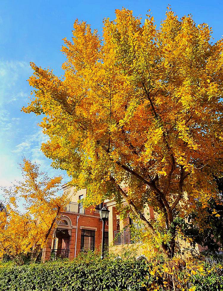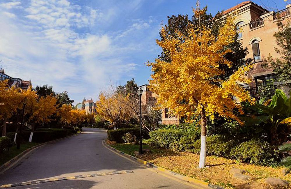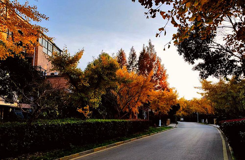 现在是深秋,叶儿都五彩斑斓了,衬着漂亮的别墅,在傍晚的斜阳照耀下…别提多美了!
