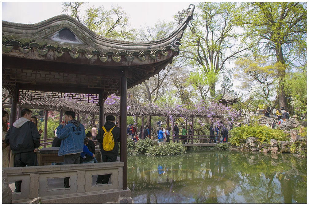....... 从留园入口进园后的一处厅堂,见物件布置古色古香,更有一着古装女立在那里欣赏,觉有些情趣,就拍了。后来一看,左边两个现代衣着游人对画面有些破坏,没办法,游人不断,避不开的,没扎堆就算不错了!权当是“穿越”吧!(《庆余年》第二部开播,哈哈!)