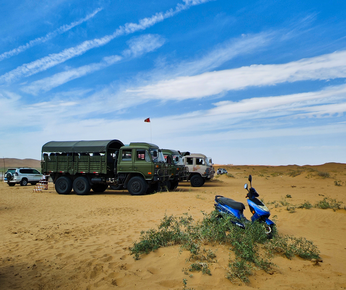 乌兰 湖不是轻松就能到达的地方,建议选择越野车,穿越腾格里沙漠,体验别样的冒险。没有冲沙经验,强烈建议找当地熟悉路况的司机,以避免危险情况发生,否则会栽进沙坑或翻车。