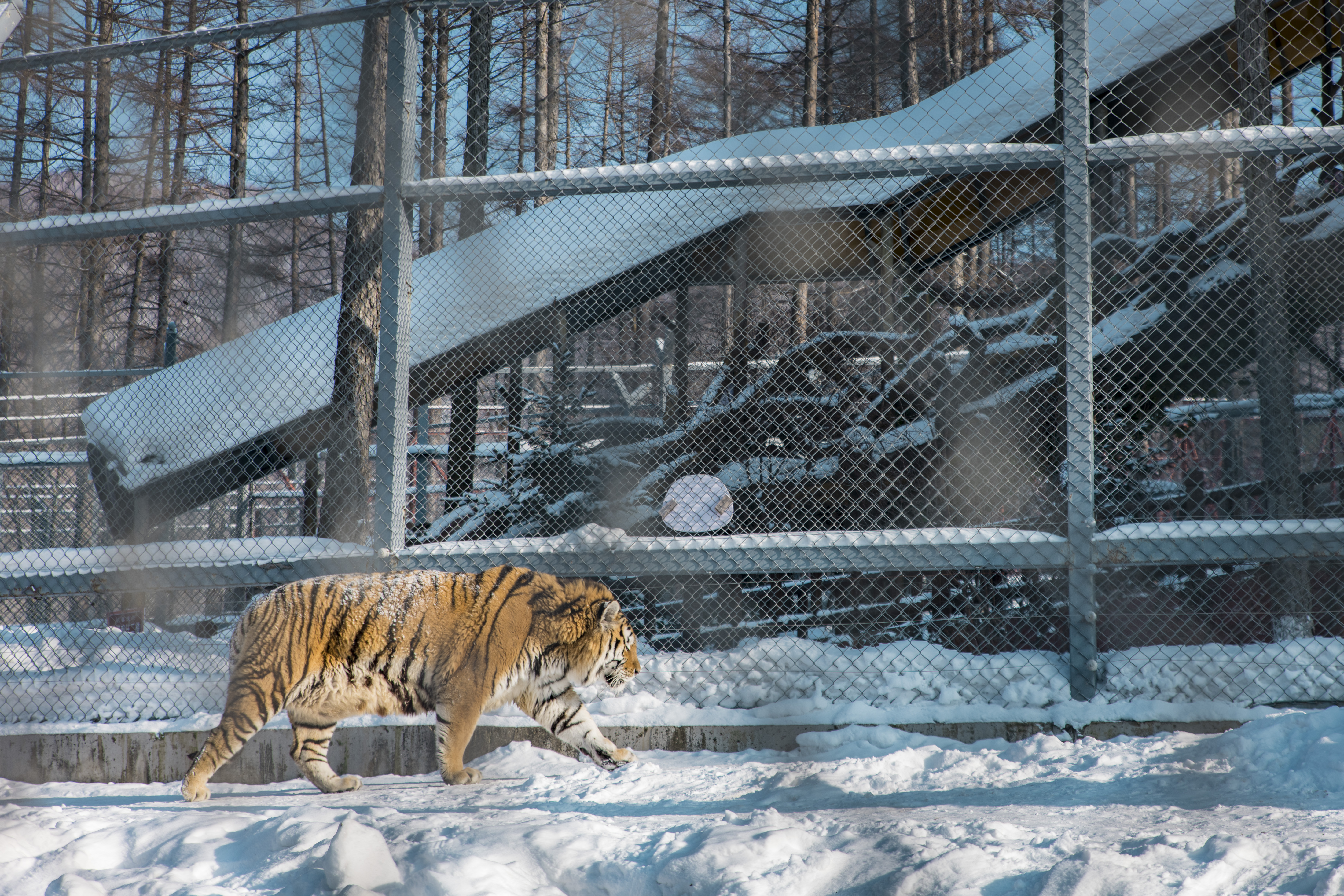 早餐后,穿过茫茫林海雪原,来到横道河子镇,前往横道河子虎林园。路程270公里,用时3.5小时。