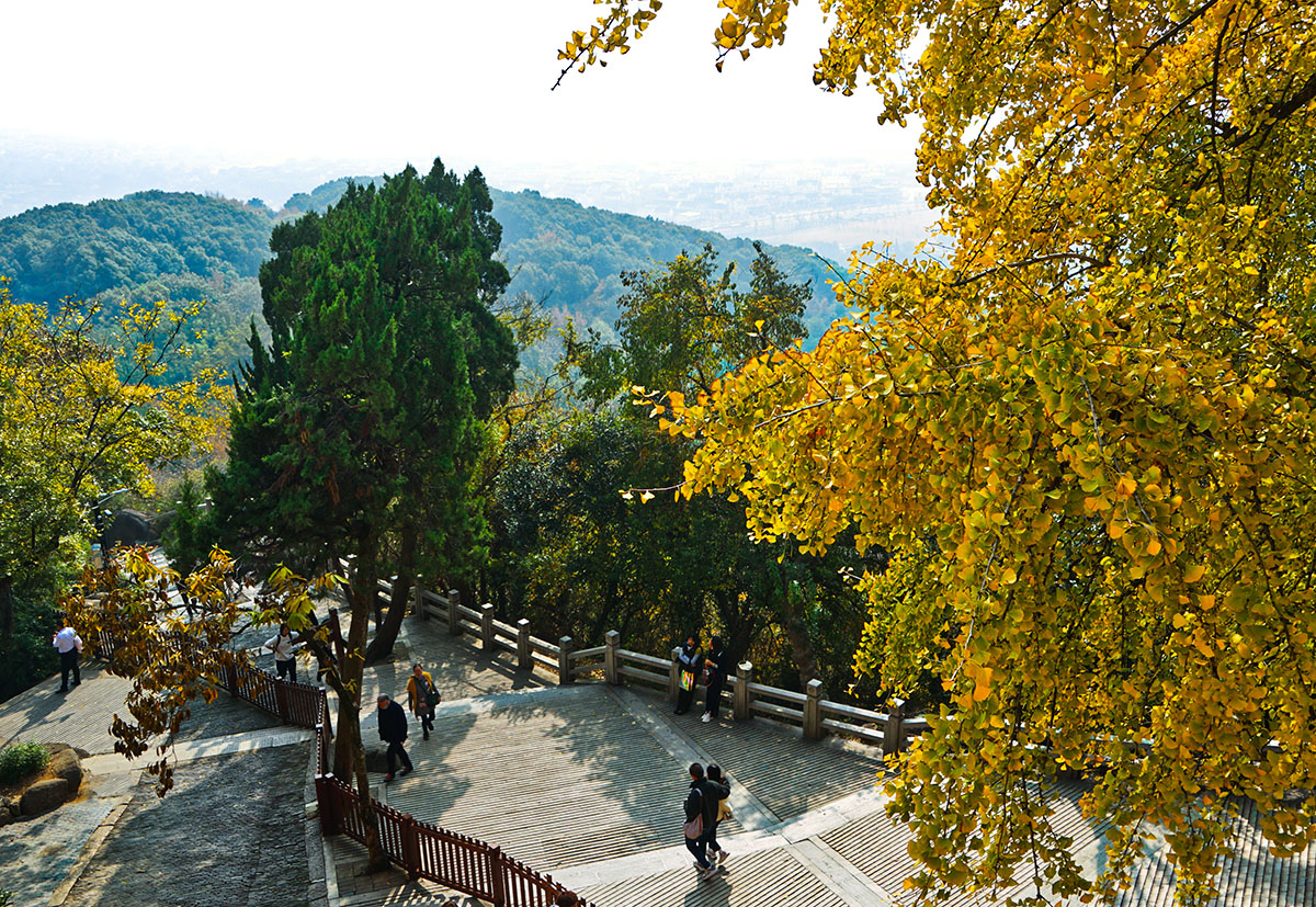 由此拐弯,可从登天平路,经一线天、飞来石、望枫台到中白云亭,继而向上,过卓笔峰至去上山顶,环顾四周,近看远眺,农田林网,延绵群山,浩瀚太湖,绘制成一幅充满时代气息的江南山水书卷,瑰丽壮观,生机勃勃。
