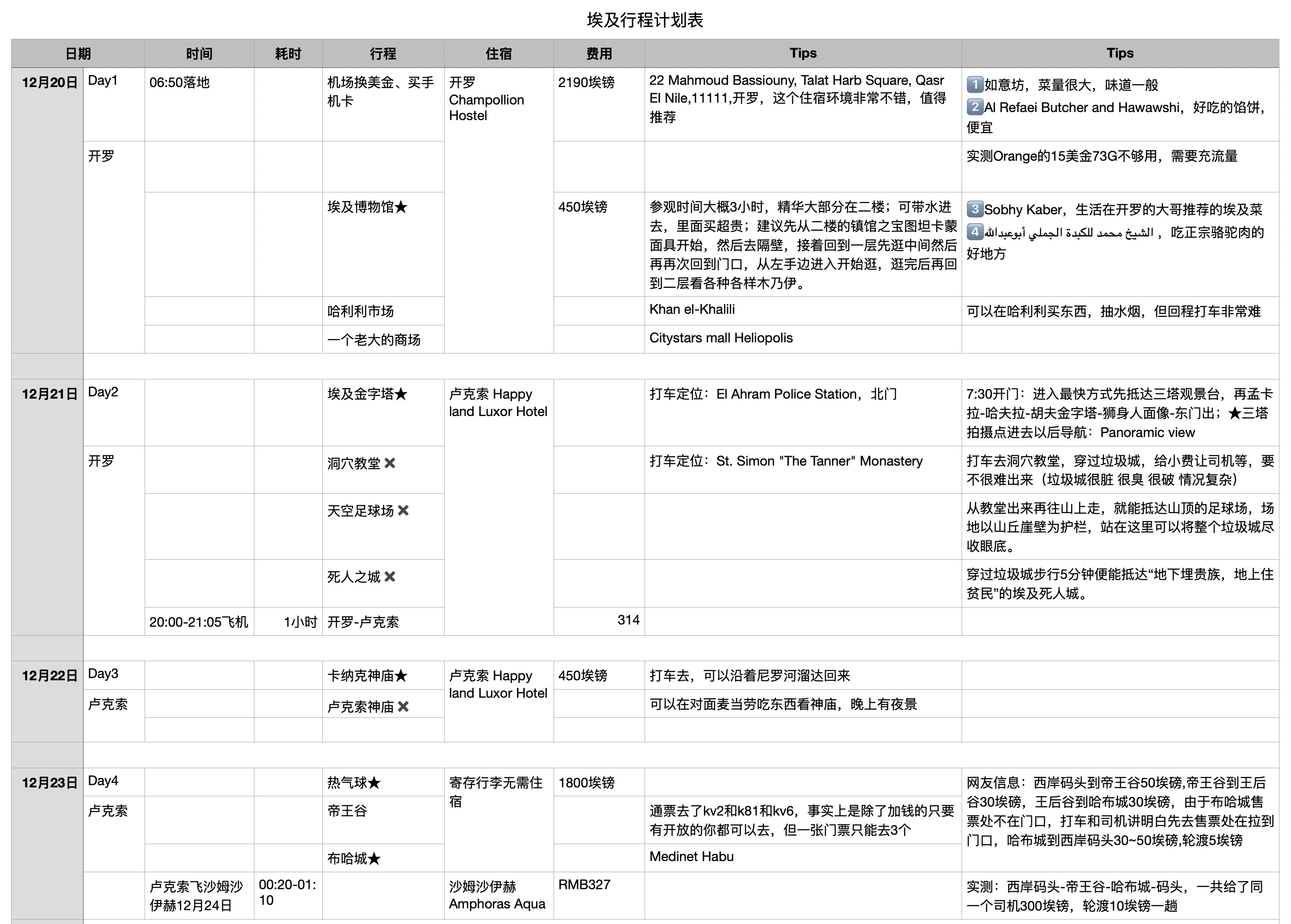 我们的行程一共17天,加上头尾飞行,有19天,根本还玩不完埃及。阿斯旺都没去,阿布辛贝也没见到,心心念念的尼罗河邮轮只是在卢克索坐了个摆渡船。非常想去黑白沙漠露营,但漫长的旅行到最后已经只想休息回家,就放弃了这个绝美之地。反正埃及又不是只来一次,留有遗憾,下次再去。