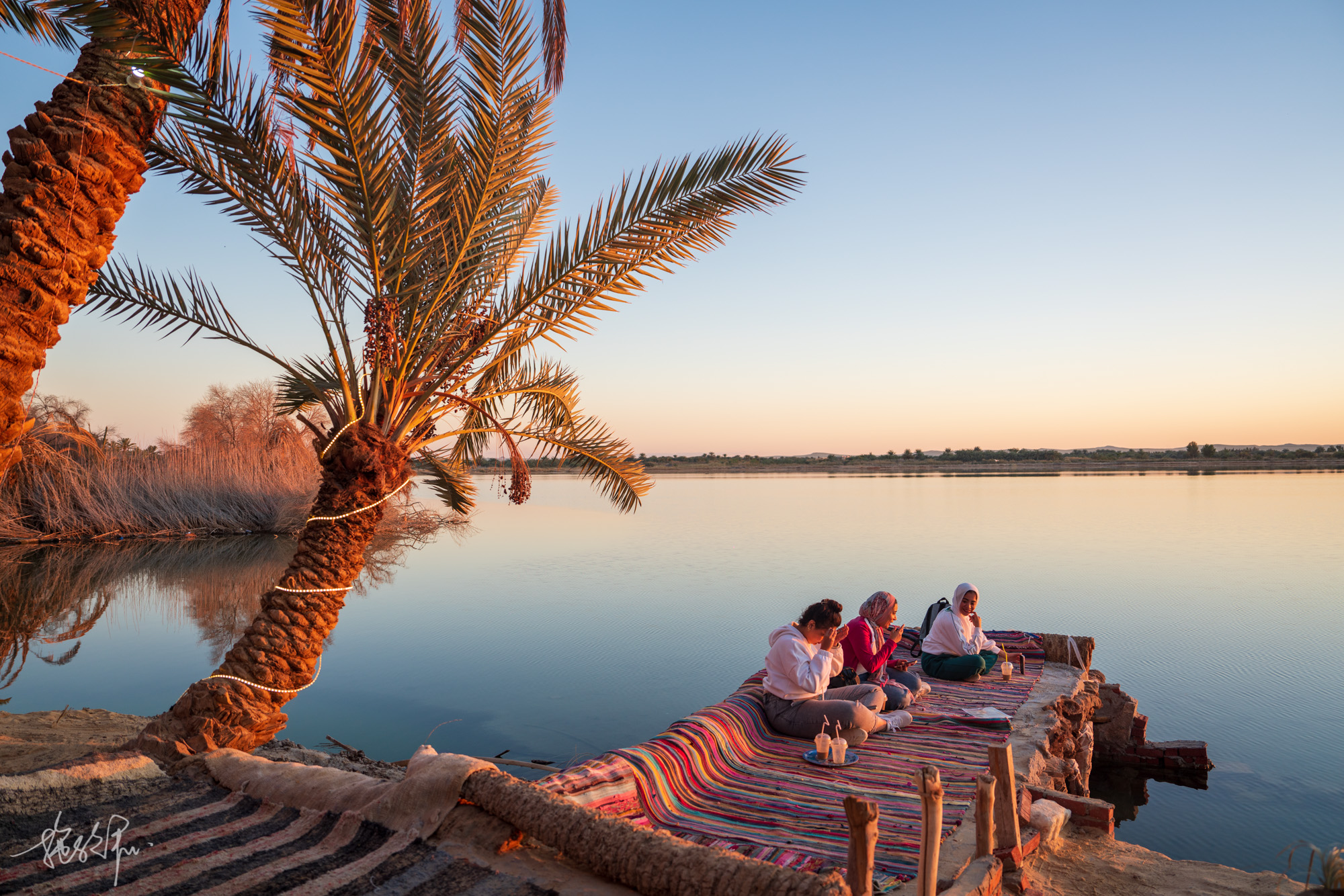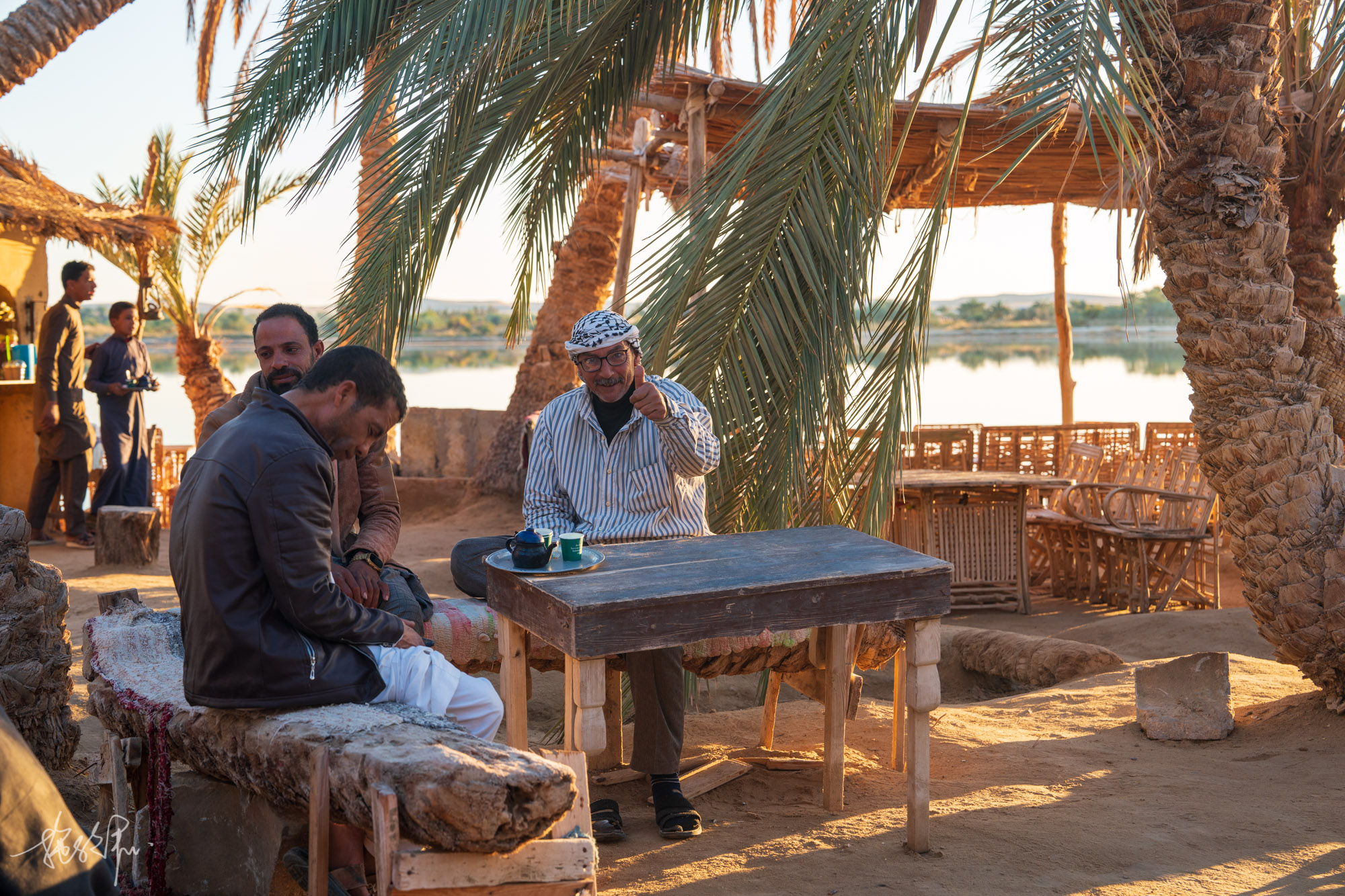 盐湖在锡瓦的东边,而Fatnas Island则是在锡瓦的西边,我们的突突车穿过一条狭窄的堤道来到了到处都是棕榈树的林子里,突然间眼前一亮,一片静谧的湖泊就在眼前,已经有许多人在此喝茶聊天等日落。我们也找了湖泊的边边,点上两杯草莓奶昔静静地等着太阳落下。