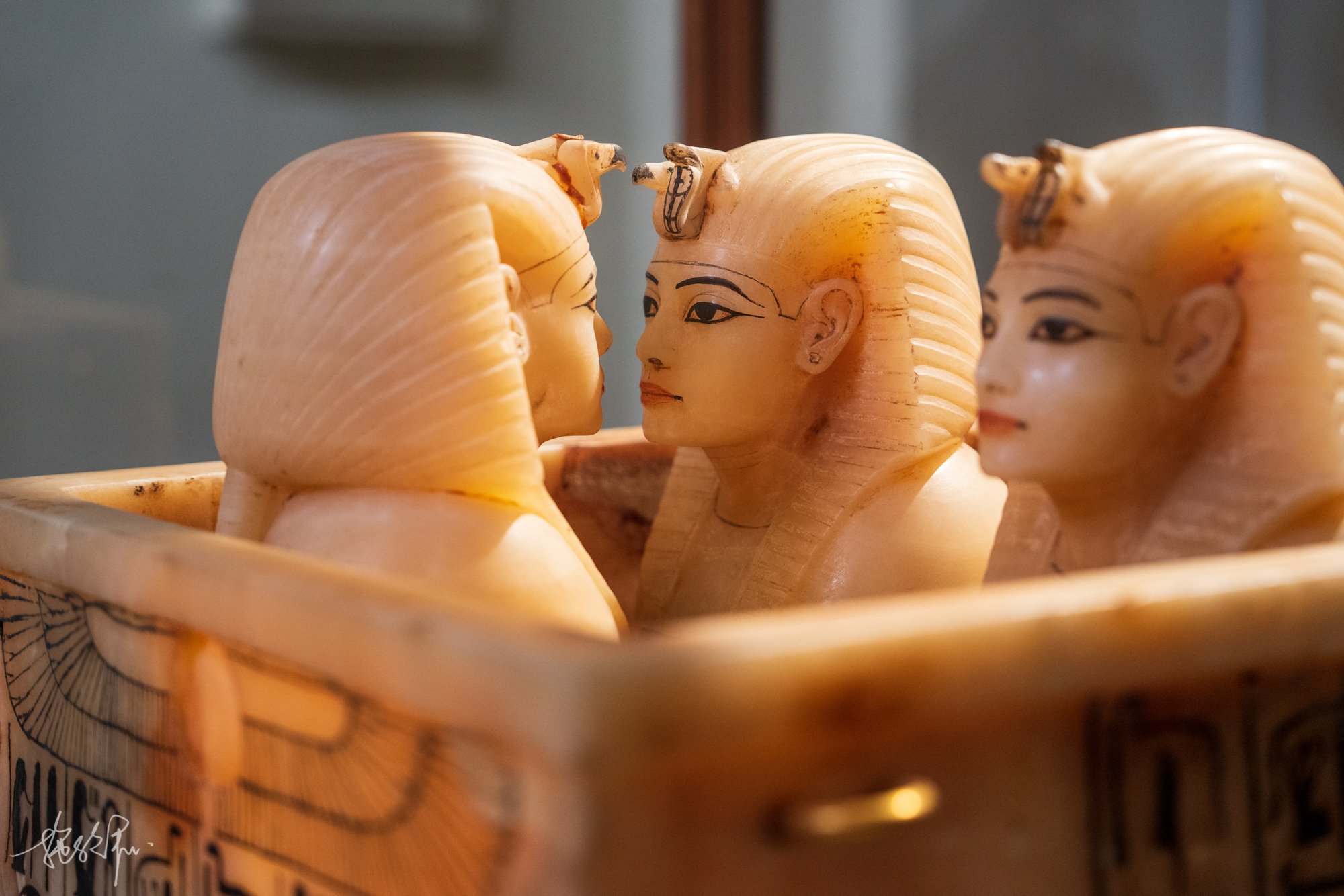 二楼有一个古埃及珠宝展,可惜拍不了照片,那里面的腰带、项链、宝石,让人看了真是令人垂涎欲滴。好在外面的图坦卡蒙王座倒是可以记录下来分享给你们看。宝座浮雕上是图坦卡蒙与王后的家居生活情景,上面有黄金、青金石、琉璃陶等等,华丽无比。