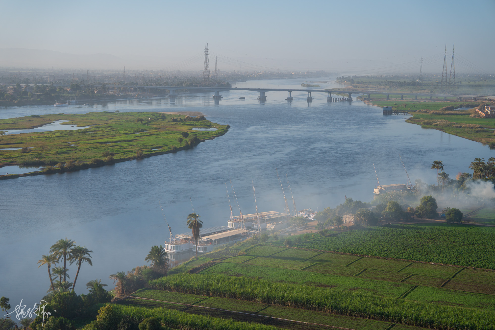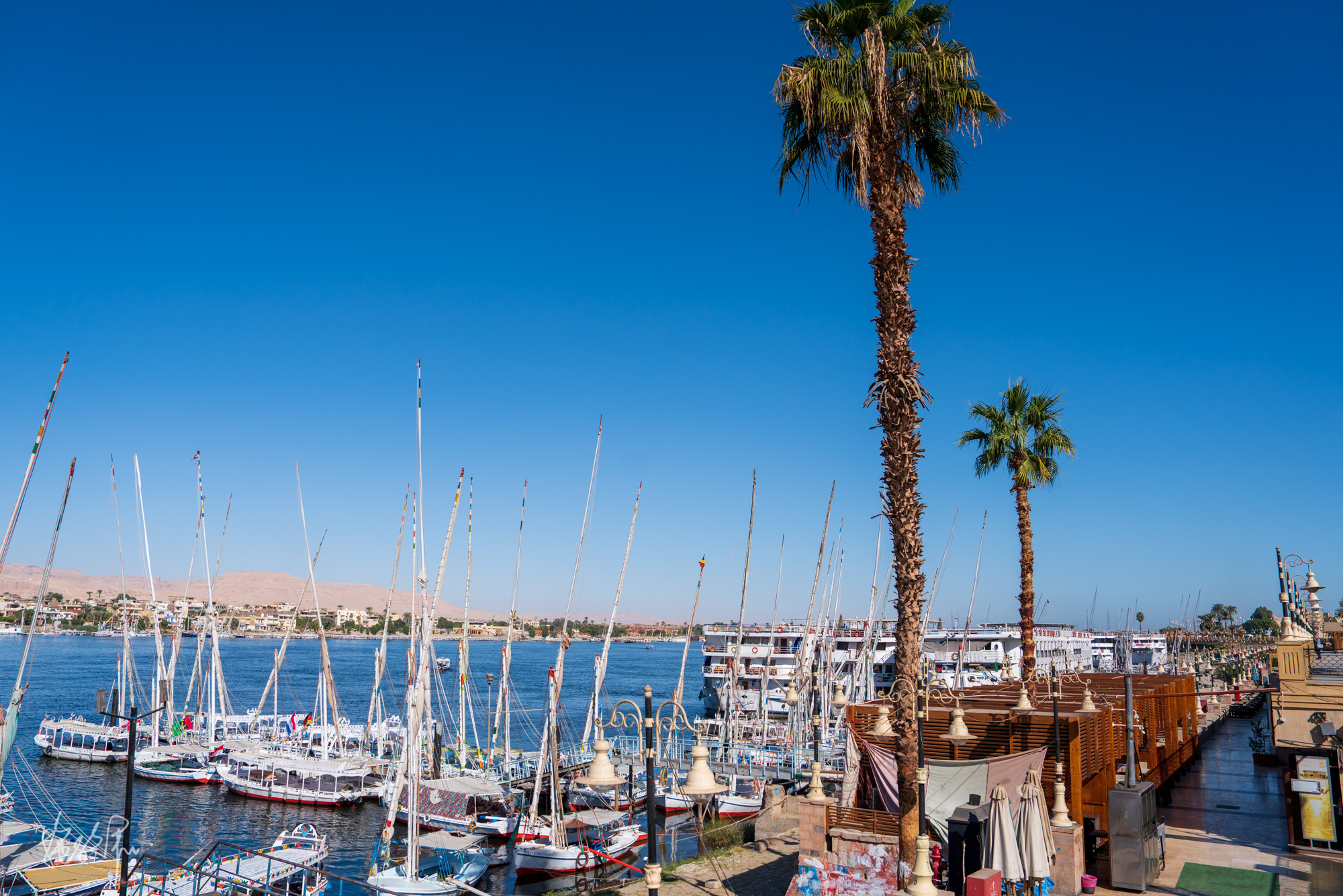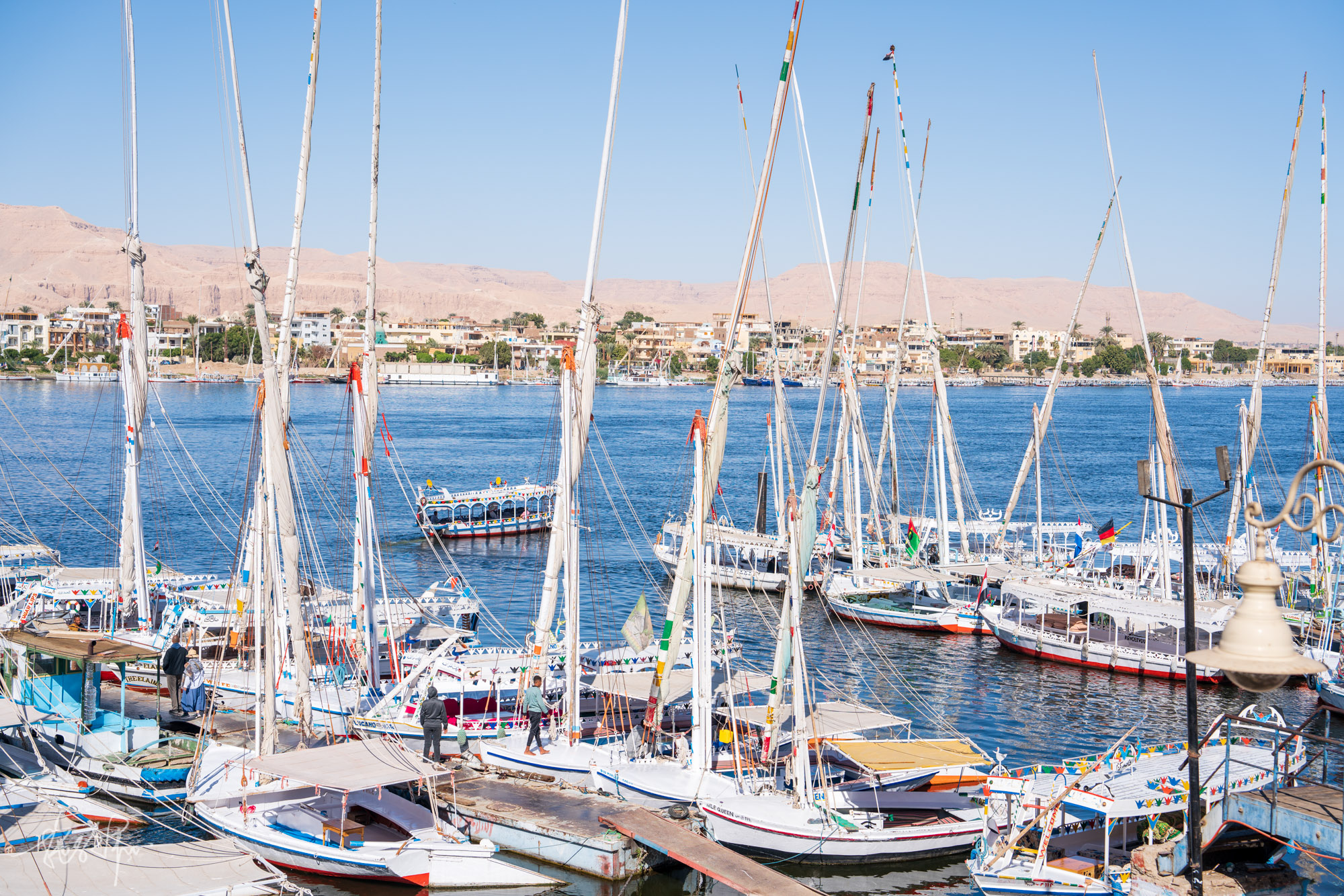 开罗飞卢克索一个小时,我们入住在老街里的一个青年旅舍。第二天睡醒走路不到10分钟就可以看到尼罗河,这是第一眼的尼罗河,可真美啊。图中的私人小船10磅一人,就可以去河的对岸了。