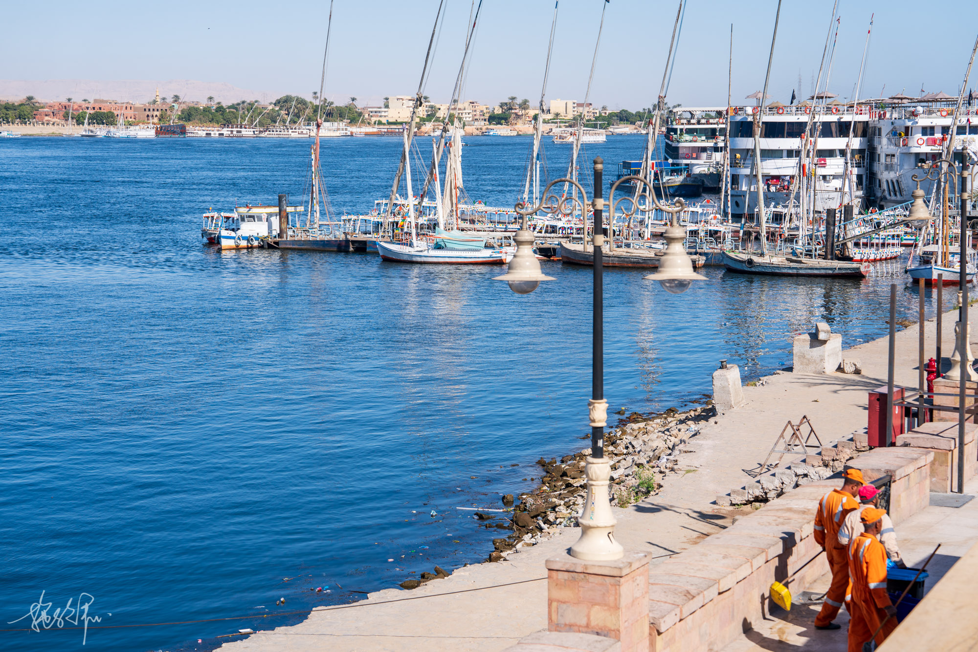 从旅舍走出来十几分钟就看到了尼罗河,哇哦,第一眼的尼罗河蓝到心里去了。就这样走走停停,原本想去公共码头乘坐船票5磅的轮渡,结果在路上还是被船夫拉走了去坐10磅的小船。既来之则安之,享受着在尼罗河上短暂的飘摇,我们下船了。