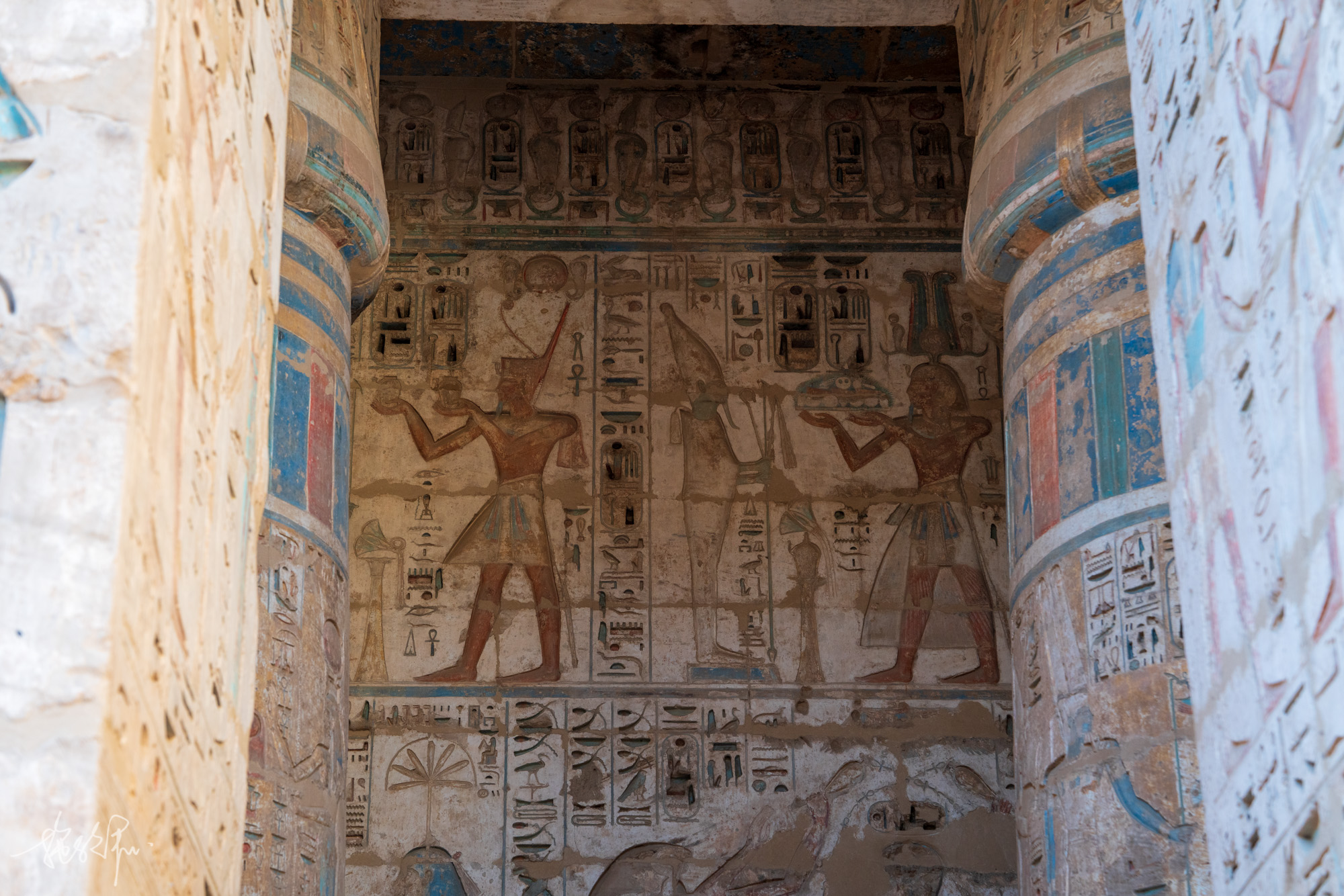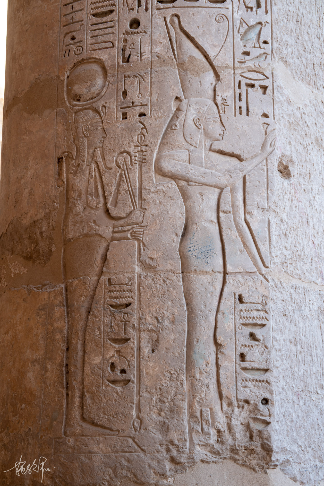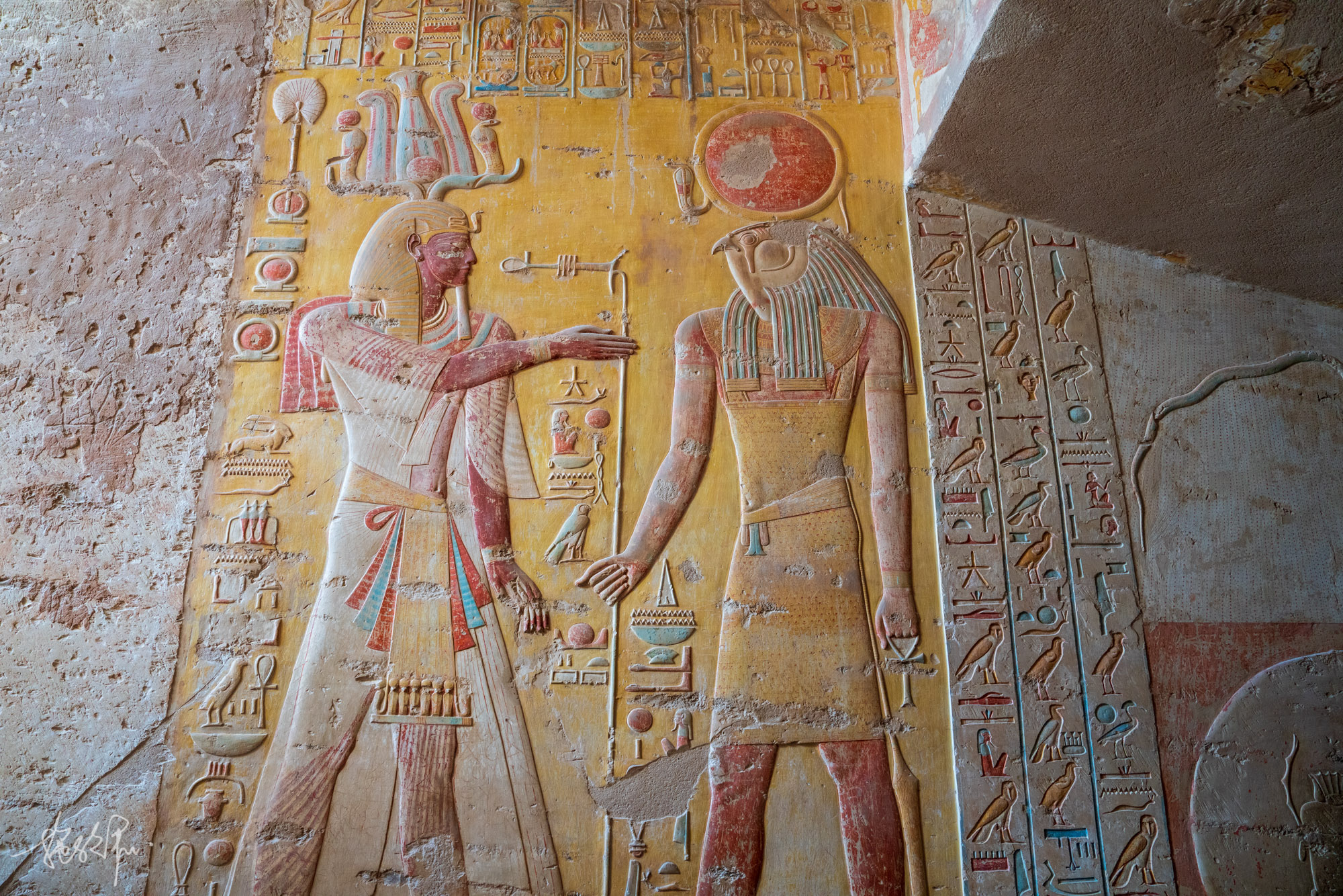 卢克索的白天还是挺热的,12月了还是很多小姐姐都穿着小吊带背心在逛帝王谷。KV8麦伦普塔赫之墓,入口左侧的这幅画是整个KV8最好看的,左边是精心雕刻的法老麦伦普塔赫,正在向右边的太阳神拉致敬,太阳神拉是鹰头人身,头上戴着太阳圆盘,手持折瓦斯权杖。再往右下方是太阳圆盘中的圣甲虫与公羊头,可惜公羊头被毁得差不多了。
