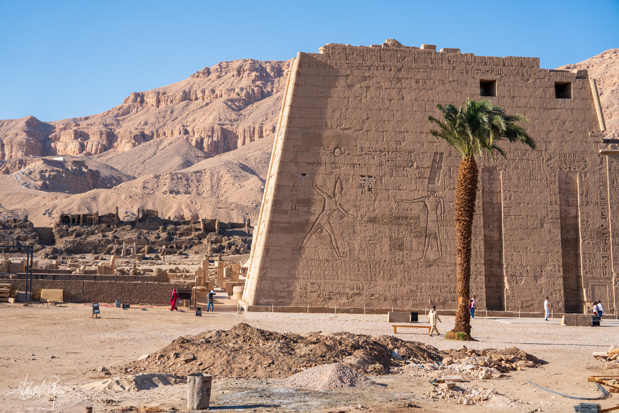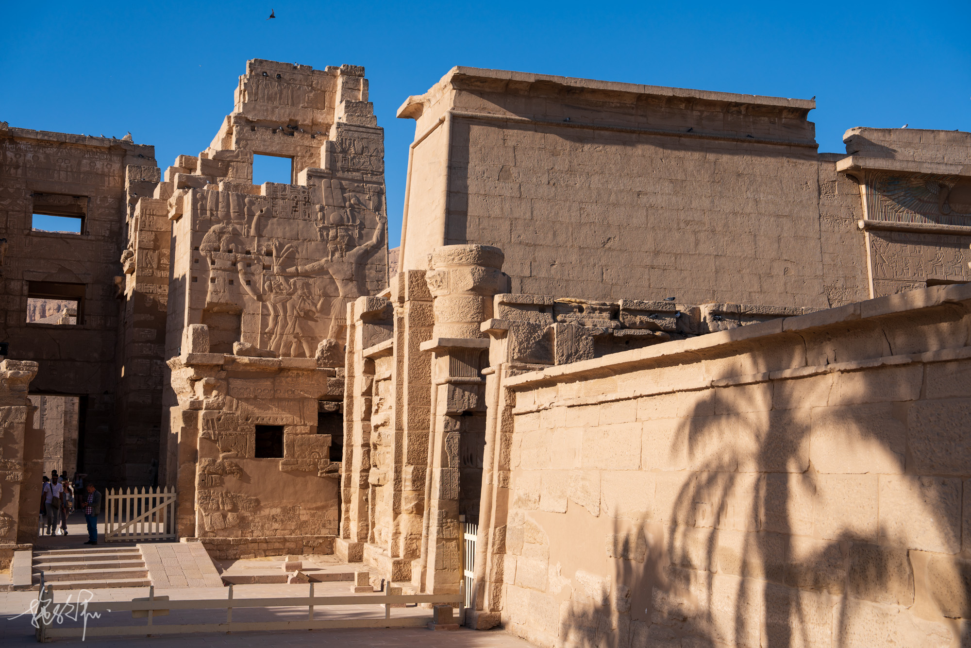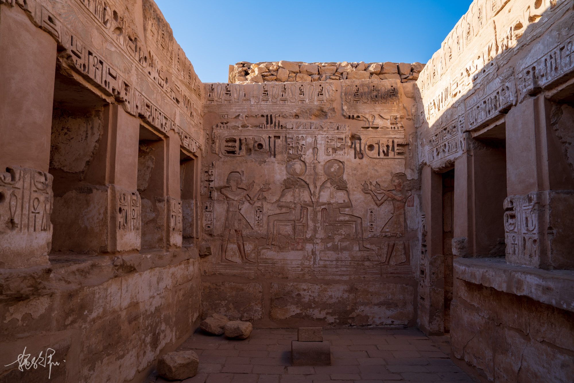 卢克索的白天还是挺热的,12月了还是很多小姐姐都穿着小吊带背心在逛帝王谷。KV8麦伦普塔赫之墓,入口左侧的这幅画是整个KV8最好看的,左边是精心雕刻的法老麦伦普塔赫,正在向右边的太阳神拉致敬,太阳神拉是鹰头人身,头上戴着太阳圆盘,手持折瓦斯权杖。再往右下方是太阳圆盘中的圣甲虫与公羊头,可惜公羊头被毁得差不多了。