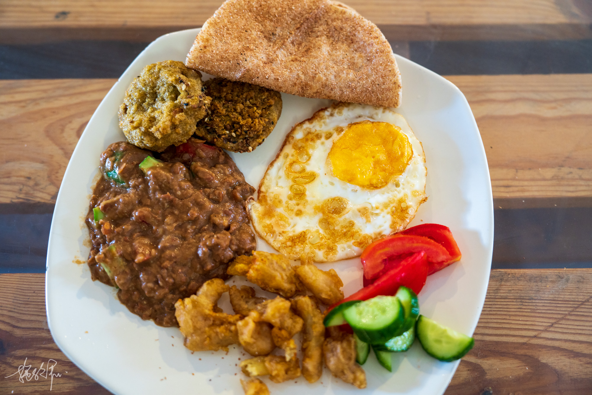 不过好在牛肉馅饼很好吃,其貌不扬,肉多皮薄又脆,还配有青椒西红柿,一个折合人民币才10元,好赞。