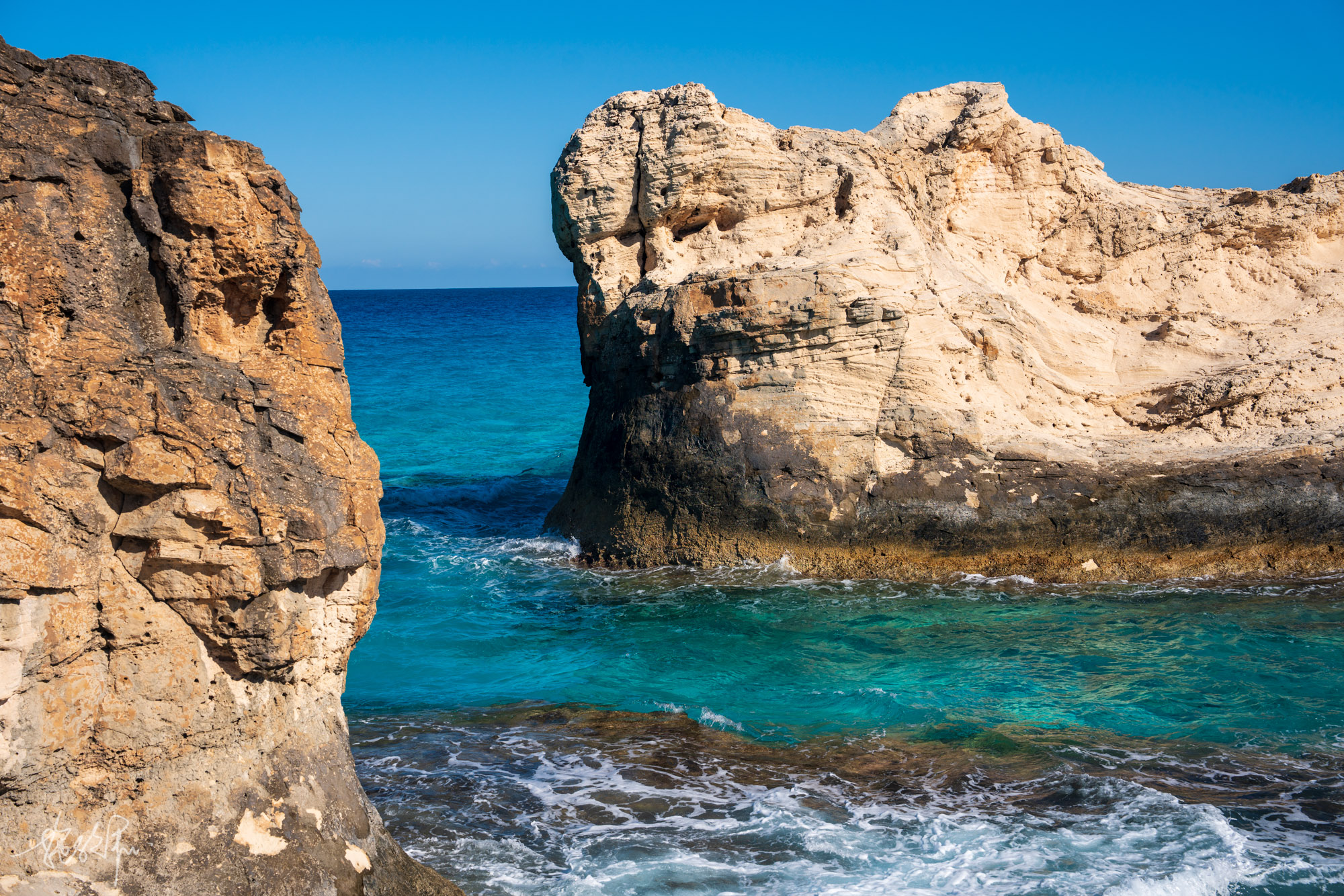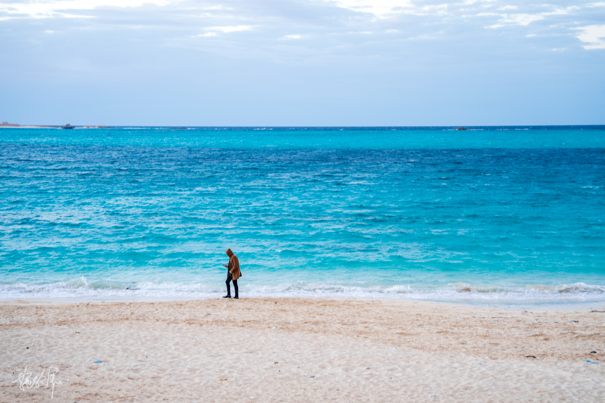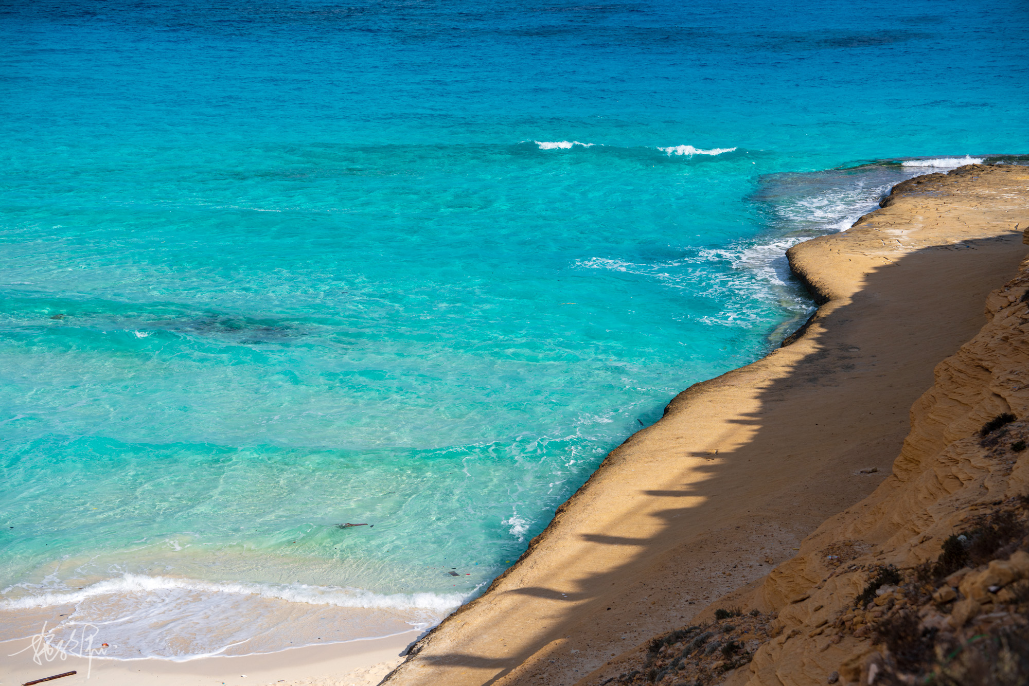 2.同一片海域,左手边层次鲜明的黄土坡上可以拍到人在悬崖上的feel。但这悬崖被海水冲断,无法直接走过去对面。