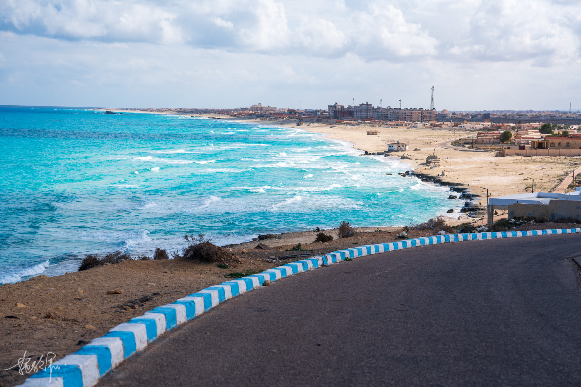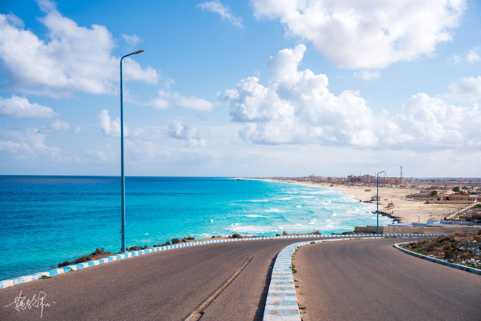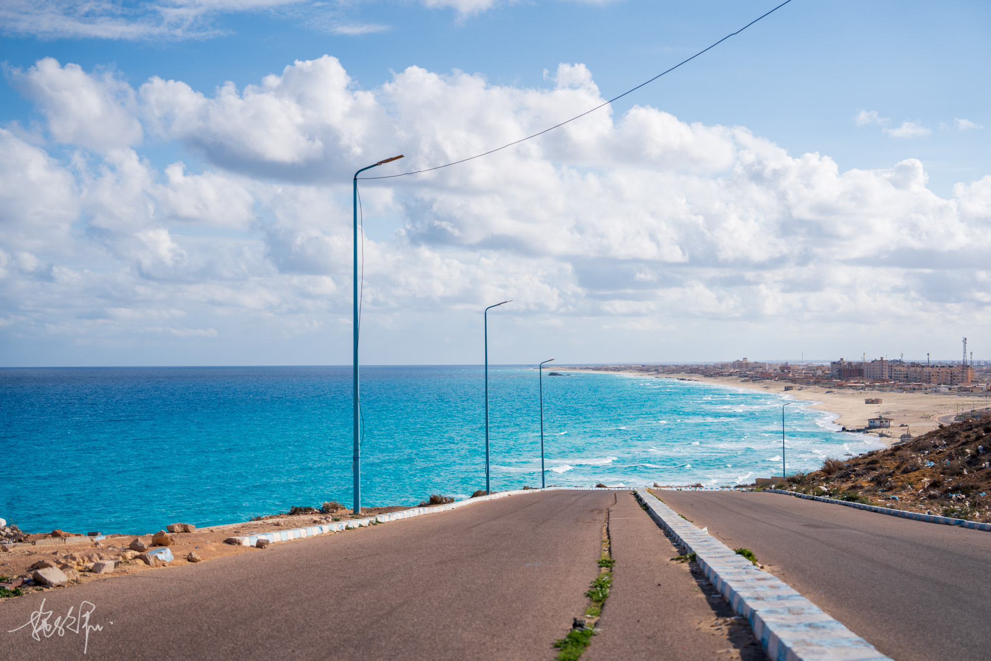 这么漂亮的地中海有谁会拒绝呢,纯白的沙滩,绝美的果冻蓝海水,就只是想这样静静地看着看着。从白沙滩回到停车场,我们再次来到了马特鲁的网红公路,一条通往大海的公路看起来就很浪漫,这样的场景仿佛看多久都不会腻的。