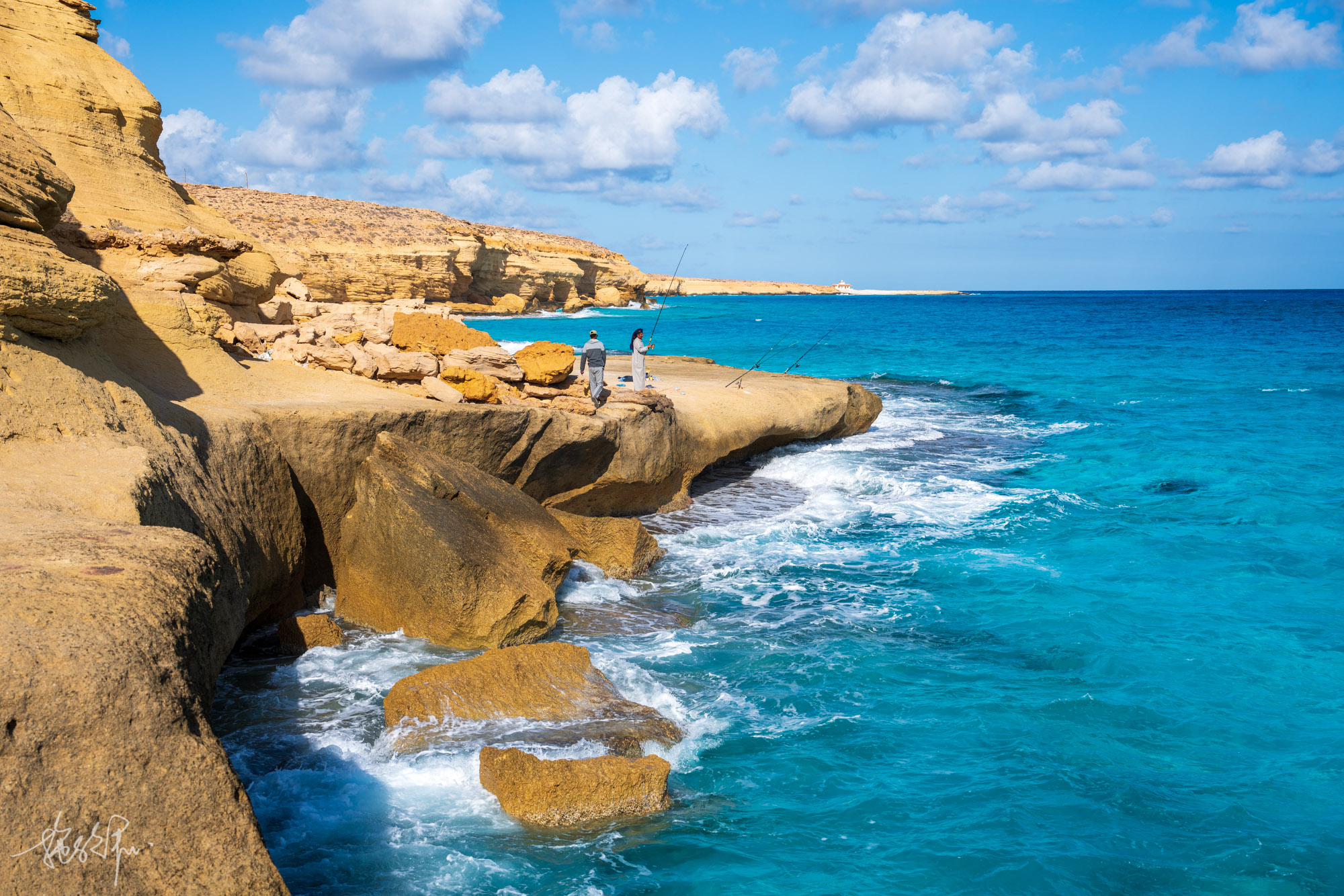 我走在坡上离海边悬崖有点近,旁边一位钓鱼的当地人就摆了一个摇摇晃晃的动作让我往上面走一些。在埃及,他们绝大部分人都是很善良的,那么多的one dollar,真的是被穷给逼出来的。