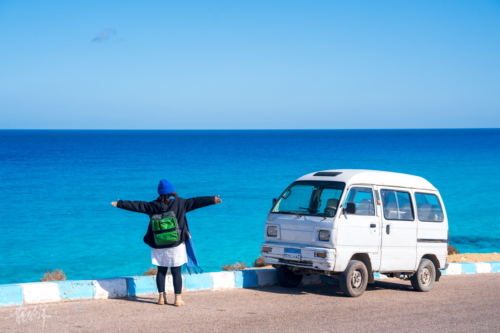 马特鲁包车在目前来看应该是300-400埃镑4小时算是正常价格,我们给了400埃镑,下午大概两点左右送我们回到酒店。Ageeba beach我昨天刚来过,陪着她们俩一起再来时,更多的就是想要享受在海边听海浪声的感觉,不需要太多感受也不走太多的路。只需要静静地看着这果冻般的马特鲁蓝,心里的幸福感就已经很高了。