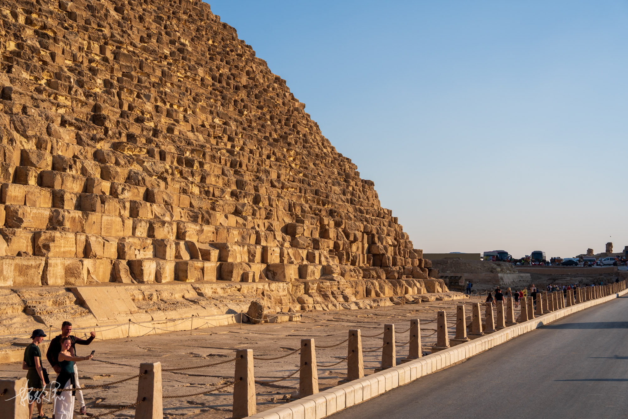 由于之前就做过功课,金字塔内部没什么可以看的,并且需要弯腰走大部分的路,而我的脚伤不允许,从一开始就放弃了这个念头。过了安检处,出现在我们眼前的就是闻名世界的胡夫金字塔,埃及最大的金字塔,它高度是146米,这些年的风化减少了9米,亲眼所见,很难想象这是公元前两千多年人类所建造而成的。
