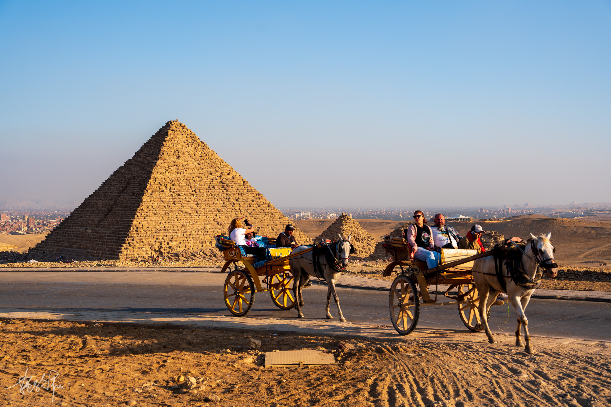 我心想果然每个骑骆驼坐马车的人都避免不了被坑一次,抵达目的地时我都担心他不给我们下马车,一定要给钱才行。好在这马夫还算不错,下了马车才跟他谈价,最终以350磅成交。如果要叫马车就是比心里预期少个50-100埃镑地去讲价,下马车时给自己一个100埃镑的空间就不算被坑了。当然这是第一次去金字塔的心理价位,回国前一天我又去了一趟金字塔,全程坐马车才200埃镑。