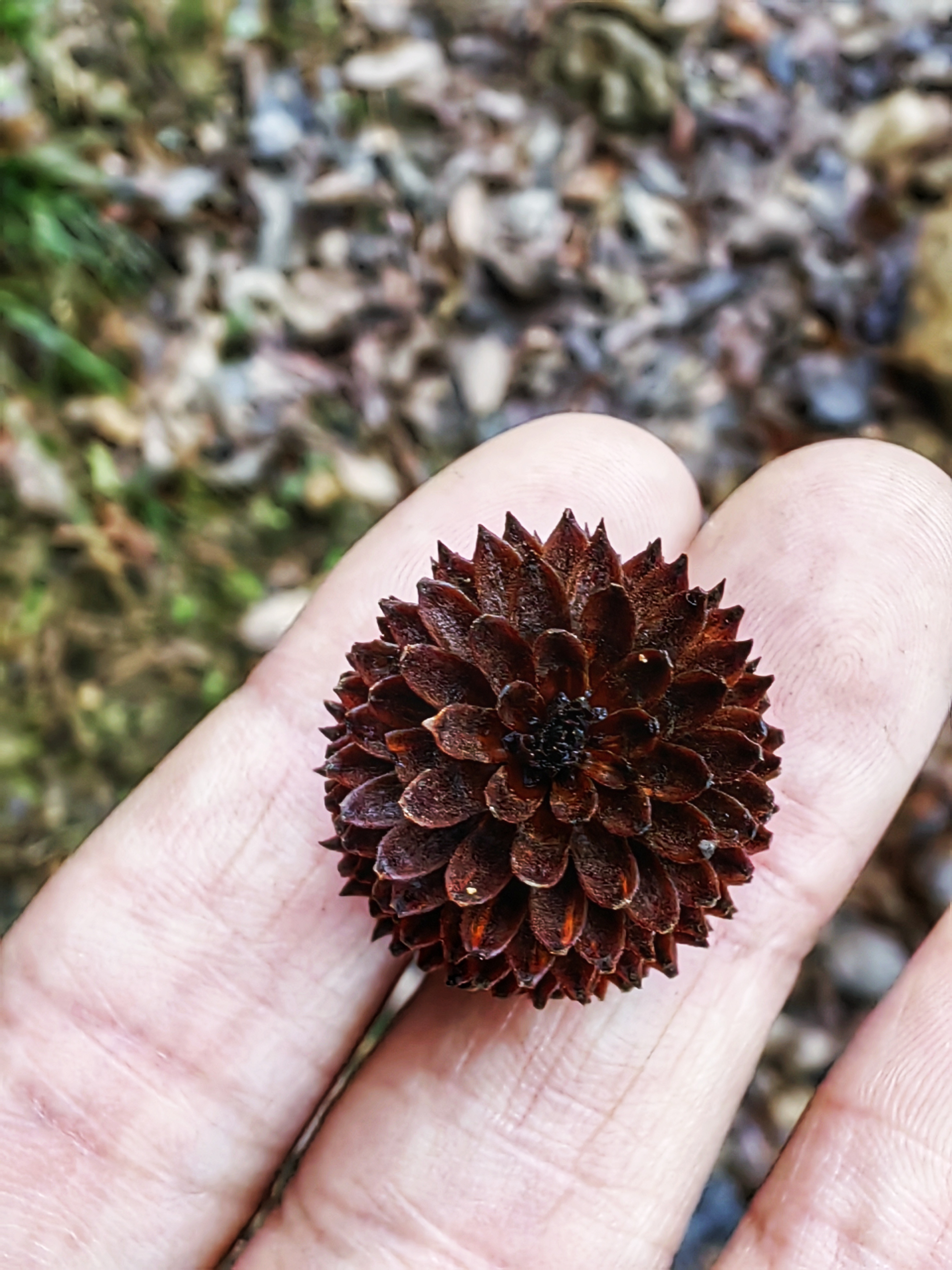 此后,山道如螺蛳壳上的螺纹,一圈圈地盘绕上去,湿滑的陡坡也频频出现,好在我带上了登山杖,长矛一样狠狠扎向前方,就有了手起刀落、又一匪首落地的畅快。渐渐的,18个人的队伍分成了好几拨,我这个天字第一号路盲绝不能在这种路上落单,就盯牢了两个男生。从前三人行我必要挤在中间,因为前怕蛇后怕鬼。现在是冬天,又是大白天,我就忽前忽后,犹如“鱼戏莲叶东,鱼戏莲叶西”一般自在,雾中的山林便成了江河湖海。