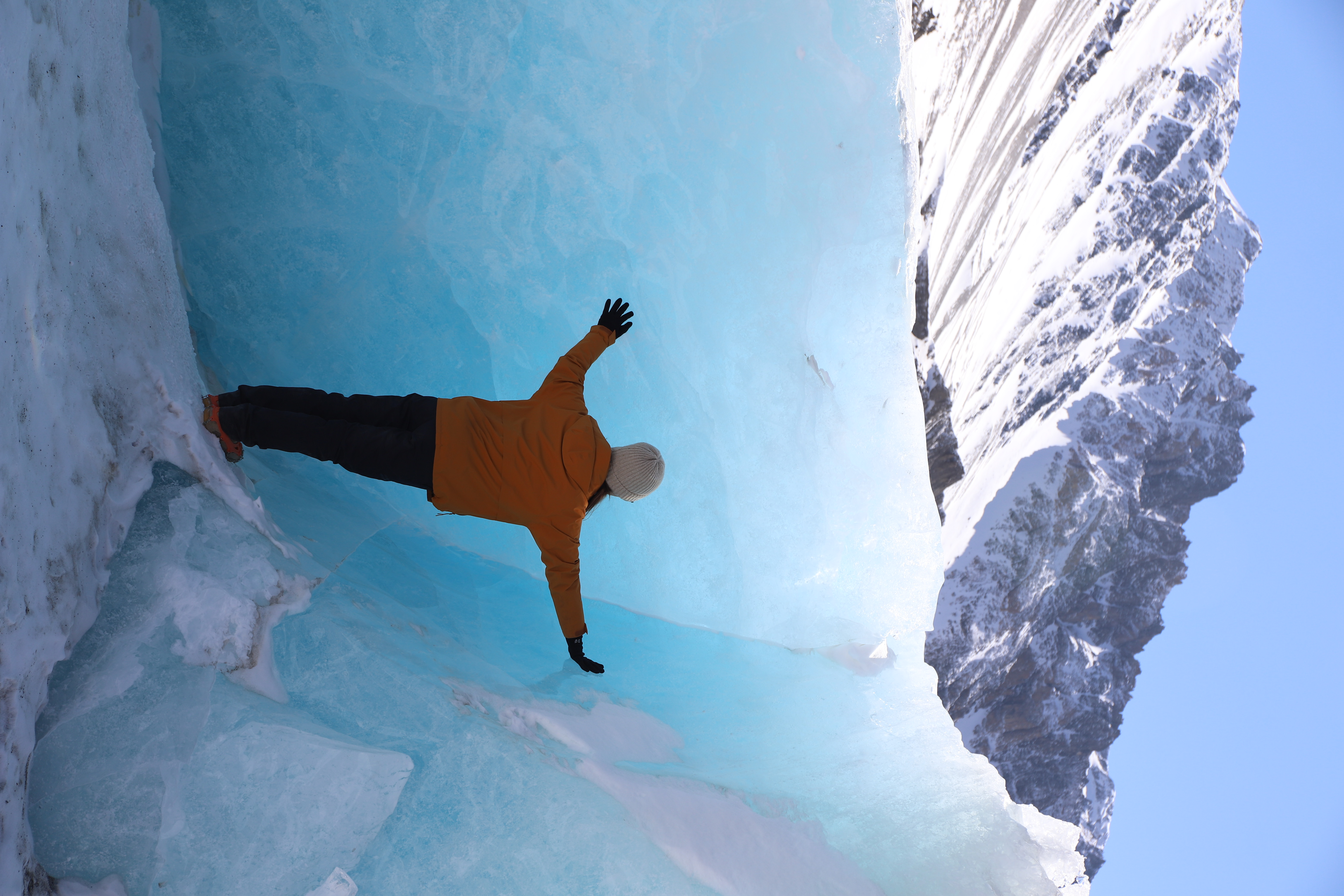 冰川的冰舌末端海拔4560米,长长的蓝冰冰舌从山谷倾泻下来,蓝冰冰块触手可及,还可以亲手触摸千年不化的冰墙