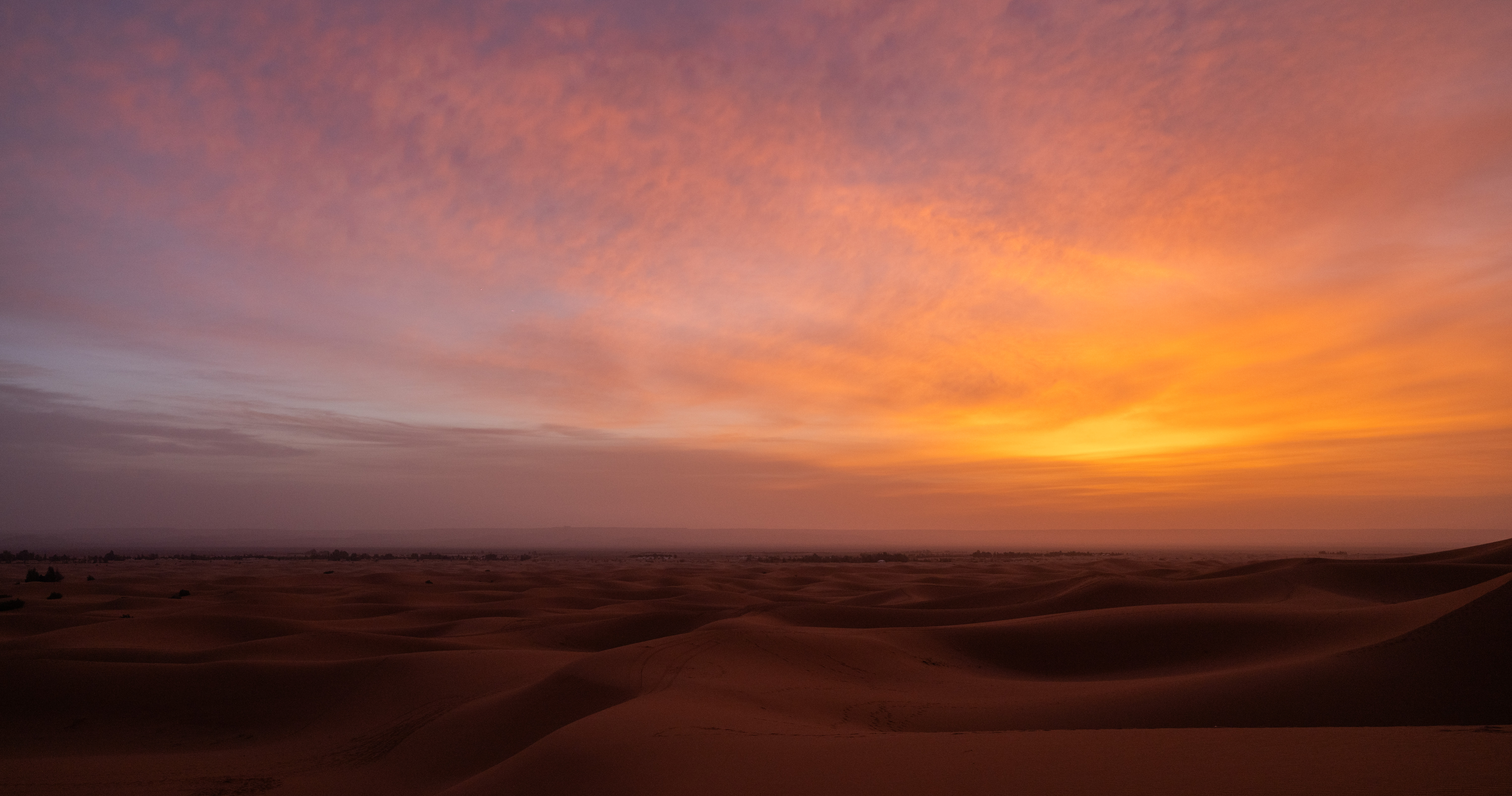 整个沙漠在阳光的照射下,从紫色变为粉色,再变成金色。五彩斑斓,叹为观止。