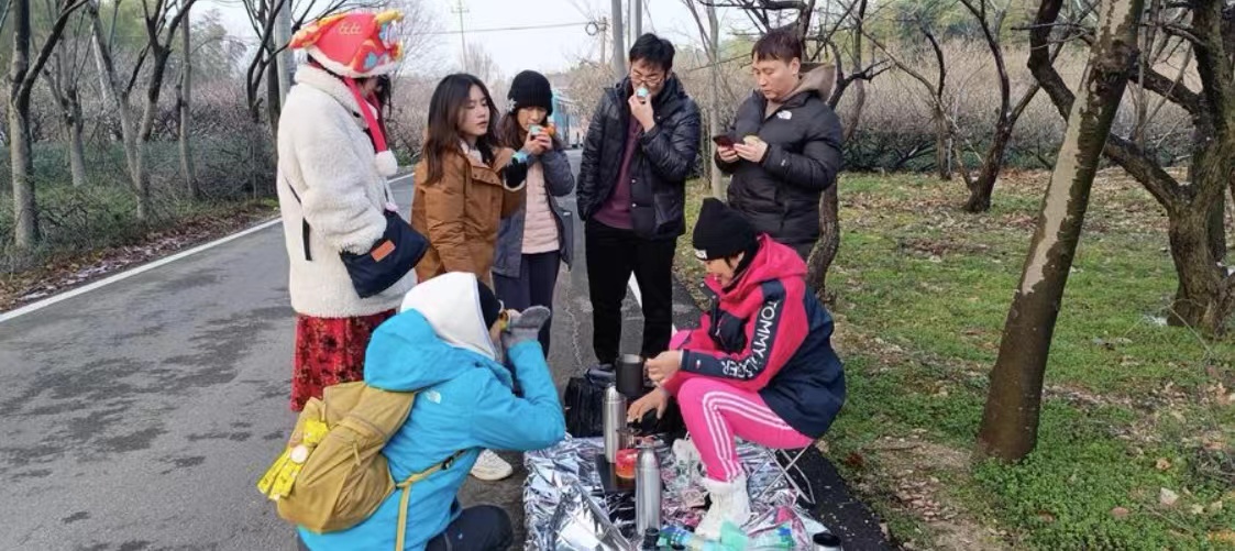 第三站淦里水库,枝上梅花将开未开,含苞待放。这里是一片青梅养殖林,漫步梅林幻想着郎骑竹马来,绕床弄青梅的情景,精灵依旧给力,各种专业设备拍的是不亦乐乎,而我就早早的回到大巴车,开始一件我谋划已久的事情,那就是摆个咖啡摊。热水是中午服务区接的,现在还依然滚烫,一罐暖暖的姜茶是给不喝咖啡的人准备的,咖啡豆在家已经磨好了,摆上我一套手冲的工具,过滤出来的咖啡液放在炉头上加热,等着队员回来喝口热乎的。第一个回来的小姐姐神奇的从怀里掏出来一包牛奶,这下除了美式,拿铁也有了。三三两两的队员回来看到这个惊喜,都自觉的在活动群里招呼大家快来喝咖啡,看着大家开心笑着冲我跑过来,然后一堆人围在我的小摊边,边喝边聊,抬头看一眼被梅花装扮的五彩斑斓的山头,深吸一口飘着咖啡香的空气,好像,我也动了买田阳羡的心思了是怎么回事?