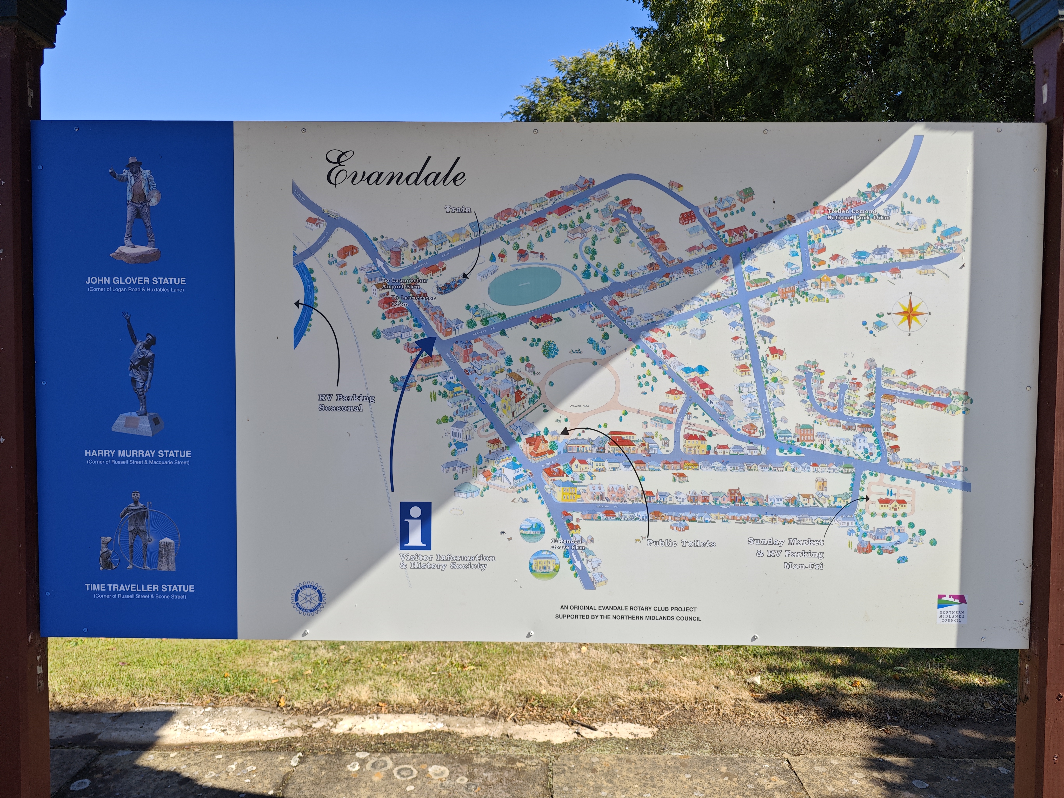 15号上午我们先赴埃文代尔(Evandale,号称塔岛保护最好的古镇,20.3KM, 0:20; 精华在Russell Street and High Street)。小镇不大,但主要景点都是上午10点开门,我们还早到了十多分钟。主街上有小镇的导览图,我按图索骥,连三座雕像都一一拜访。
